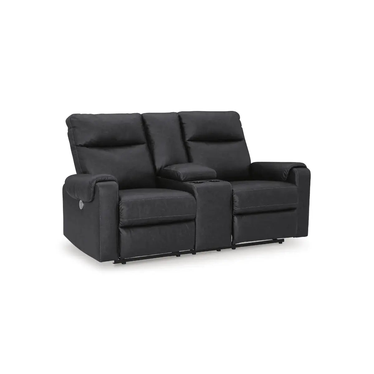 You don’t just want to recline. You want to recline in high design. This power reclining loveseat’s clean lines and supple faux leather are out to capture your heart with style and comfort. Easily tuck away remotes or gaming controllers and keep drinks close by with its handy console. This...