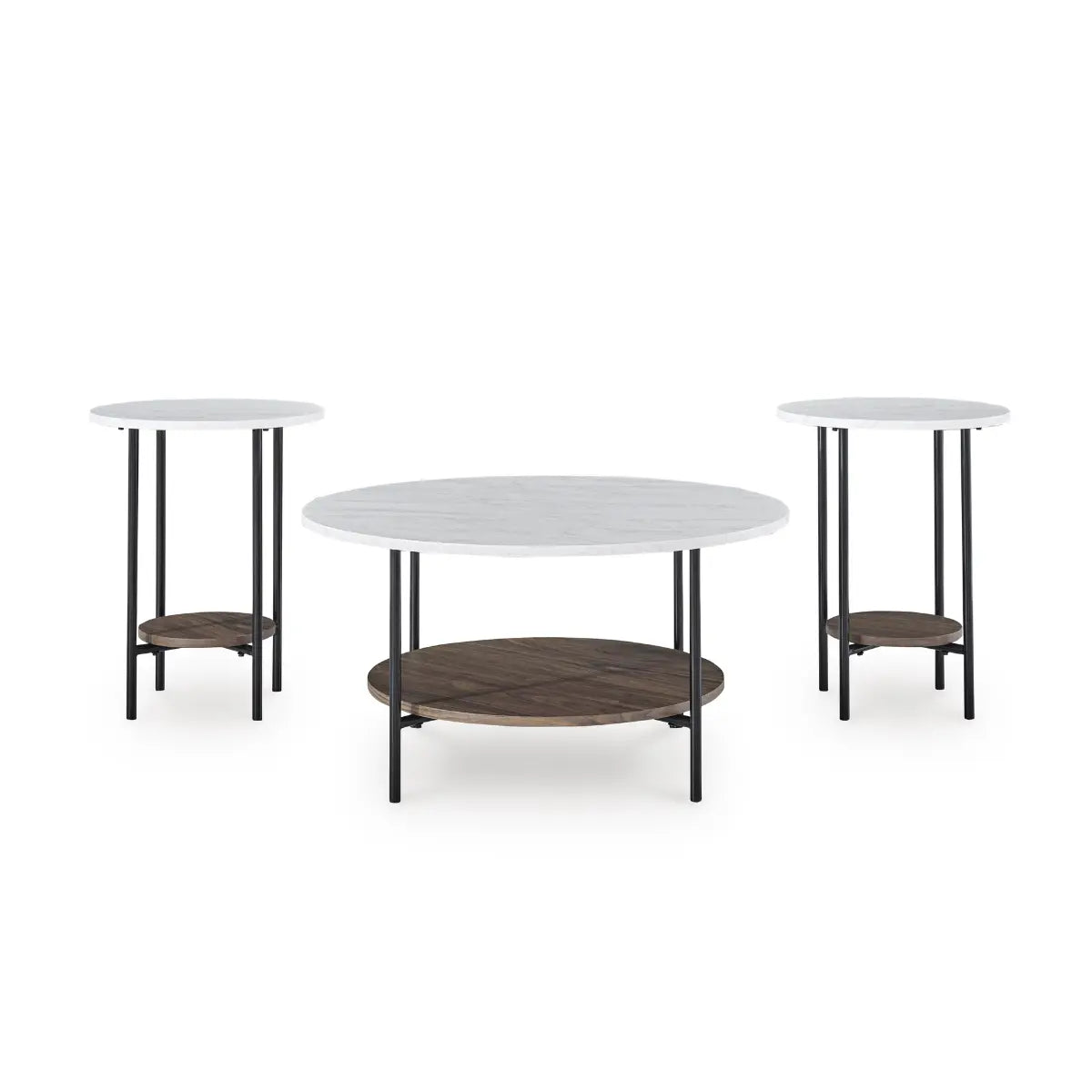 Round out your seating area with this table set. The clean-lined profile is simple, yet striking—while the faux Carrara marble tops are anything but ordinary. Black tubular metal frames, along with open storage shelves with a light natural wood grain pattern, work beautifully together from every angle. Features:  Includes coffee...