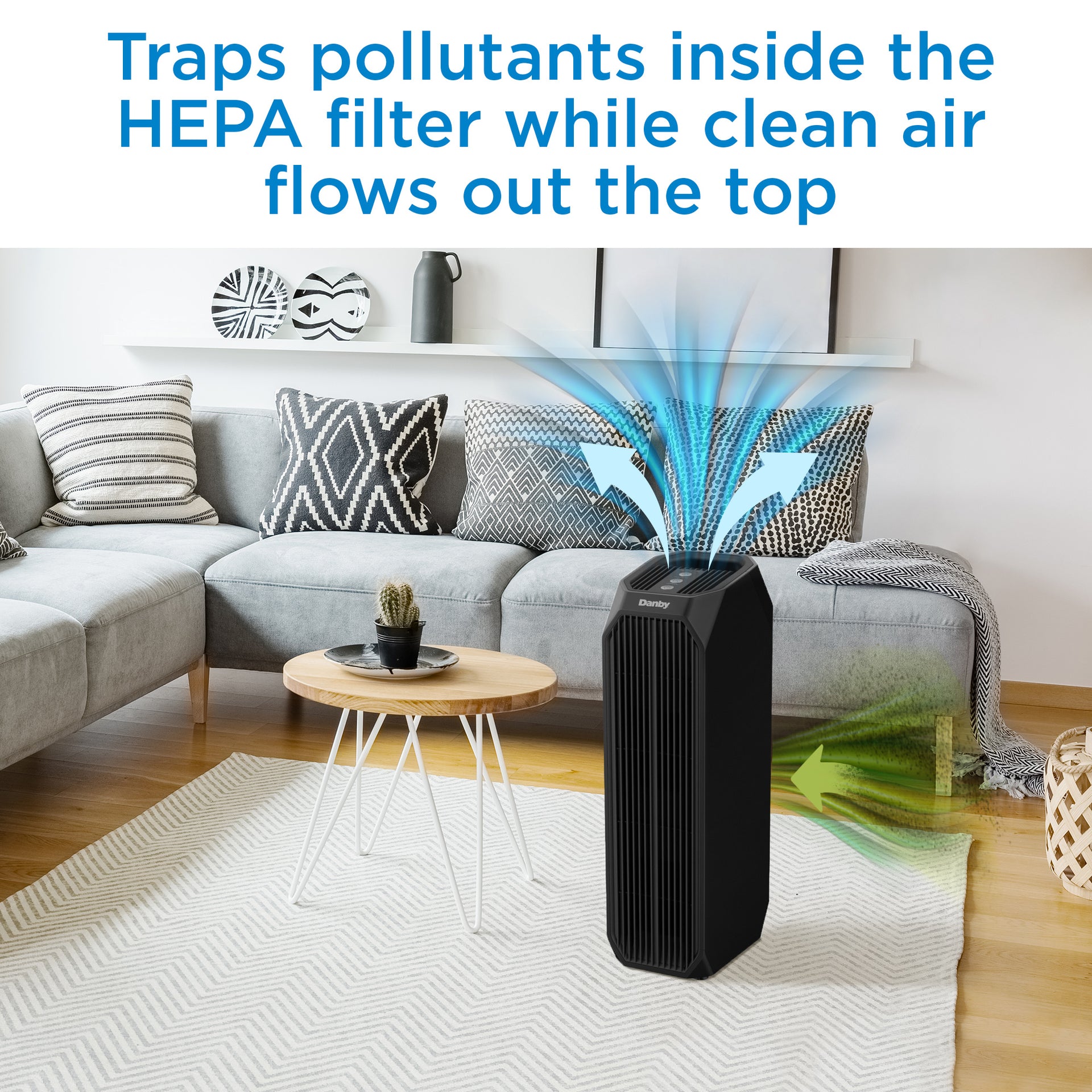 Description Features Specifications Looking for a way to help clean the air in your home? Take a look at this brand new 3-in-1 Air Purifier from Danby! This model comes with a true HEPA filter (capable of capturing up 99.97% of airborne dust, allergens, smoke, pollen, etc.), and Odor Reduction...