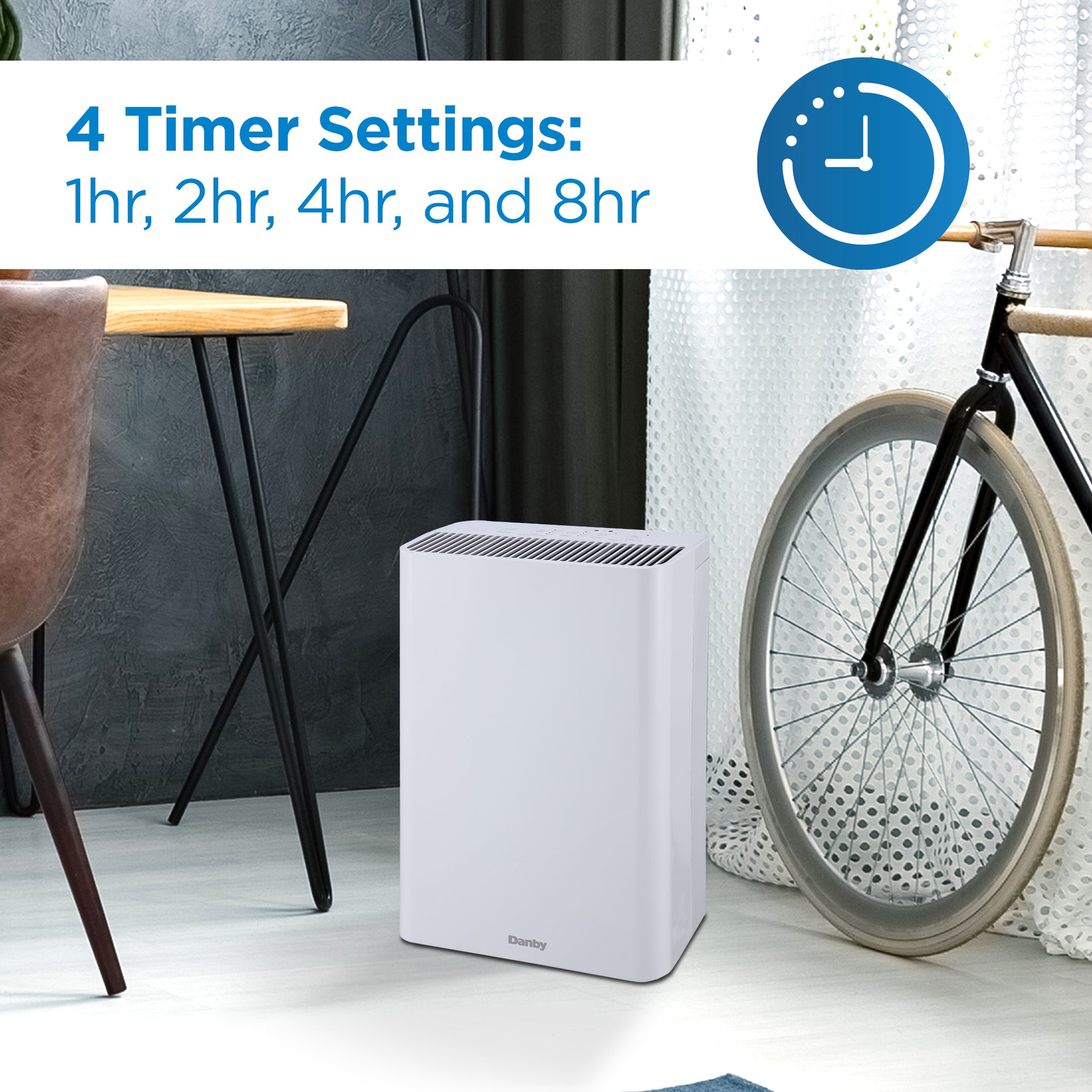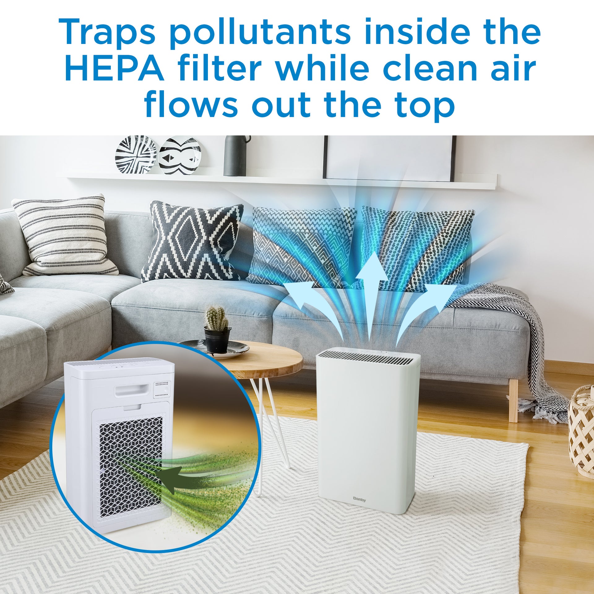 Description Features Specifications Looking for a way to help clean the air in your home? Take a look at this brand new 4-in-1 Air Purifier from Danby! This model comes with a true HEPA filter (capable of capturing up 99.97% of airborne dust, allergens, smoke, pollen, etc.), and an ionizer...