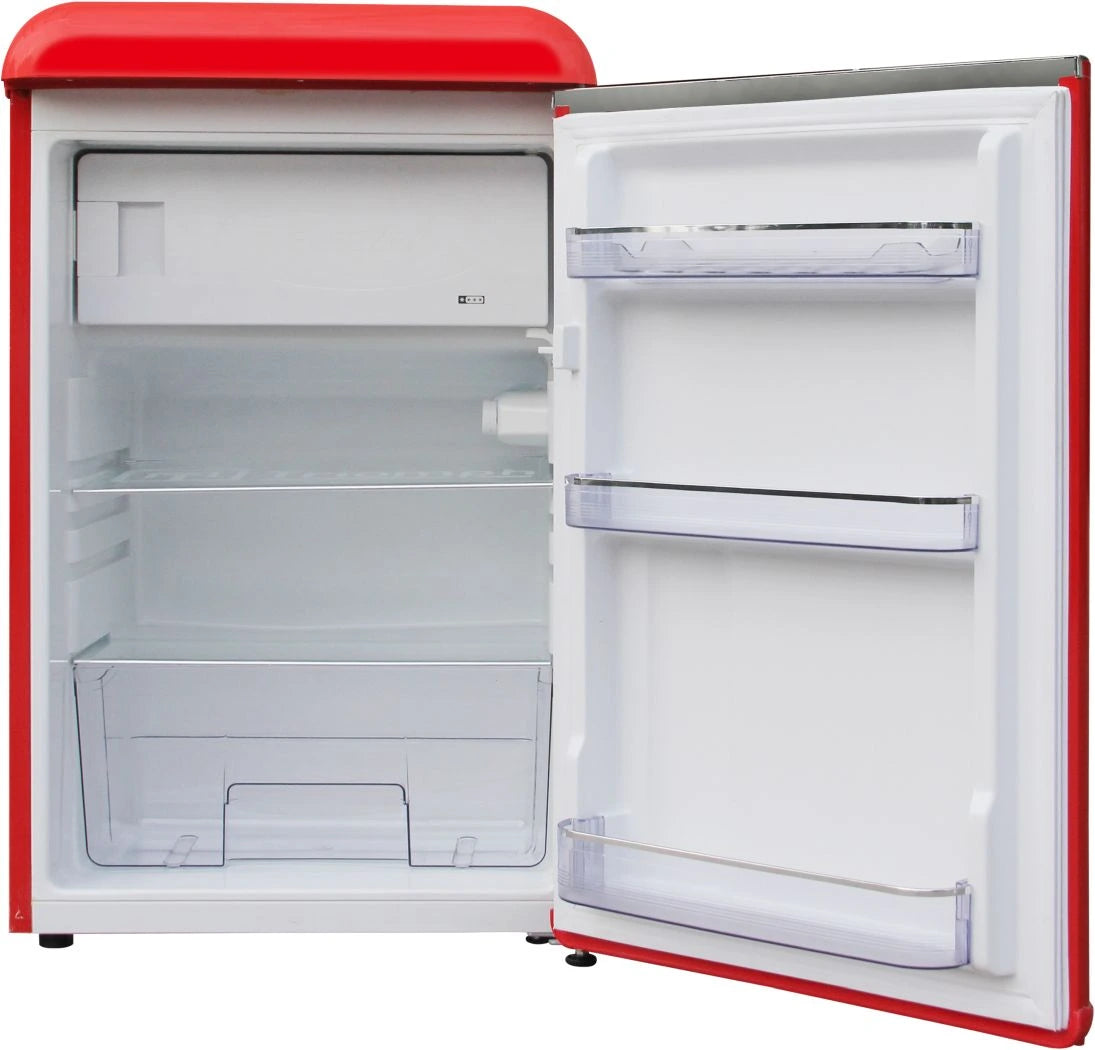 Stunning chrome handle with round exterior retro design, automatic defrost operation with a true mini freezer section, LED interior light, 1.5 adjustable glass shelves, 2 full width transparent door bins & 1 gallon door storage with chrome trim, 1 transparent crisper.  Mini Freezer Section Interior Light 1.5 Adjustable Glass Slide...