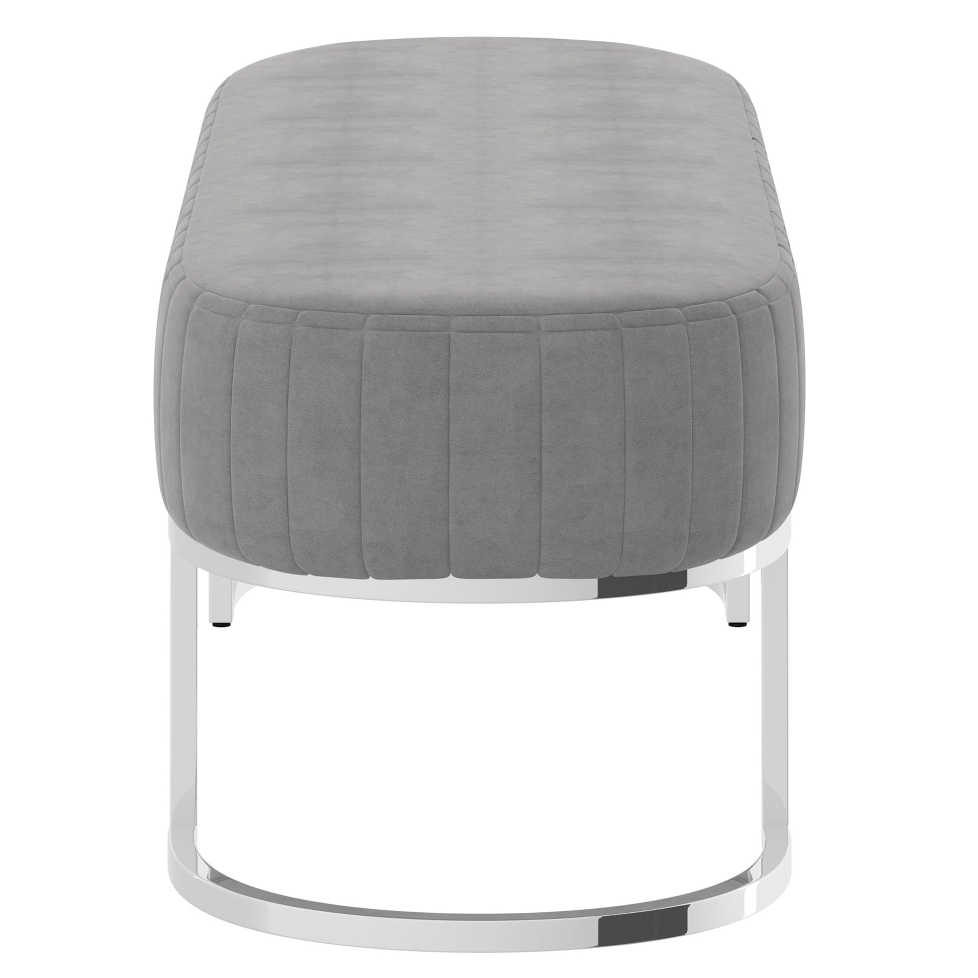 Description Features Specifications Pretty velvet upholstery with vertical tufting on the sides gives this contemporary bench a rich look. The sturdy metal frame is finished in silver, giving it a stylistic edge. The comfortable cushioned seat makes this an ideal piece to place in a entryway, hallway, living room, at...