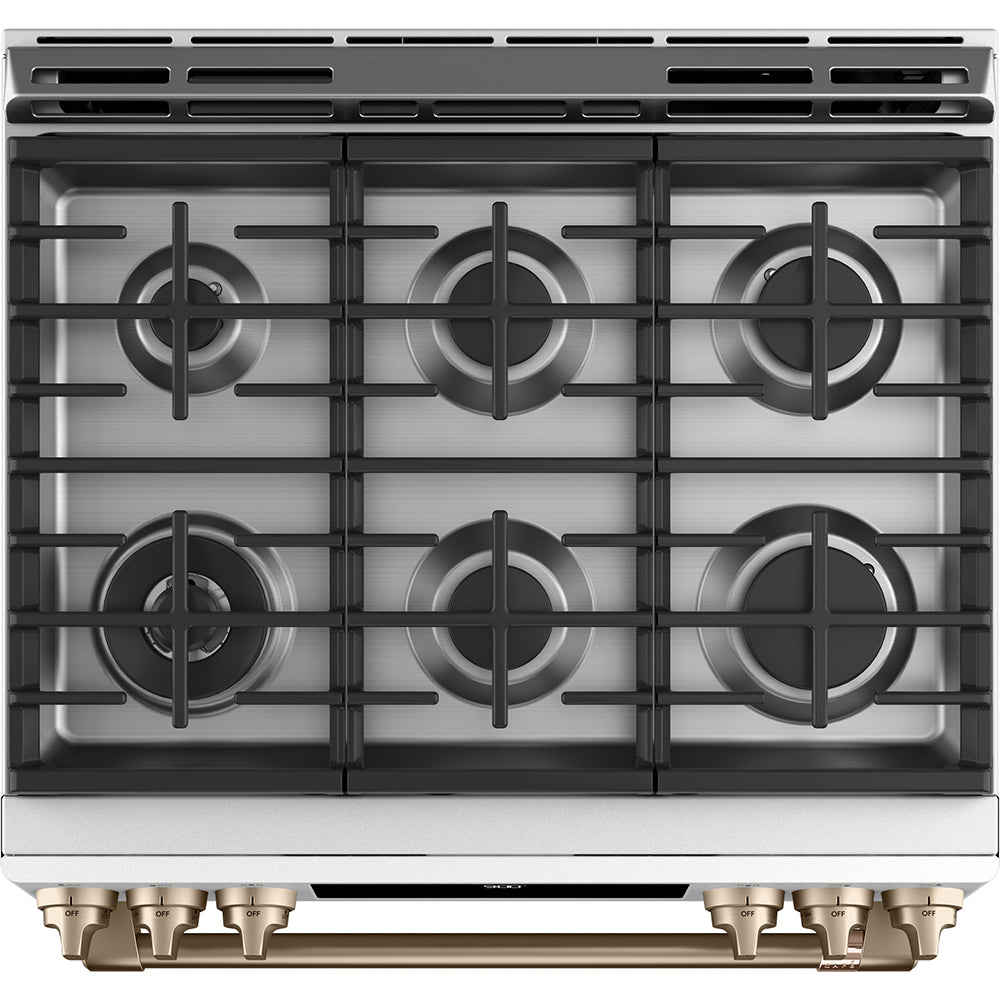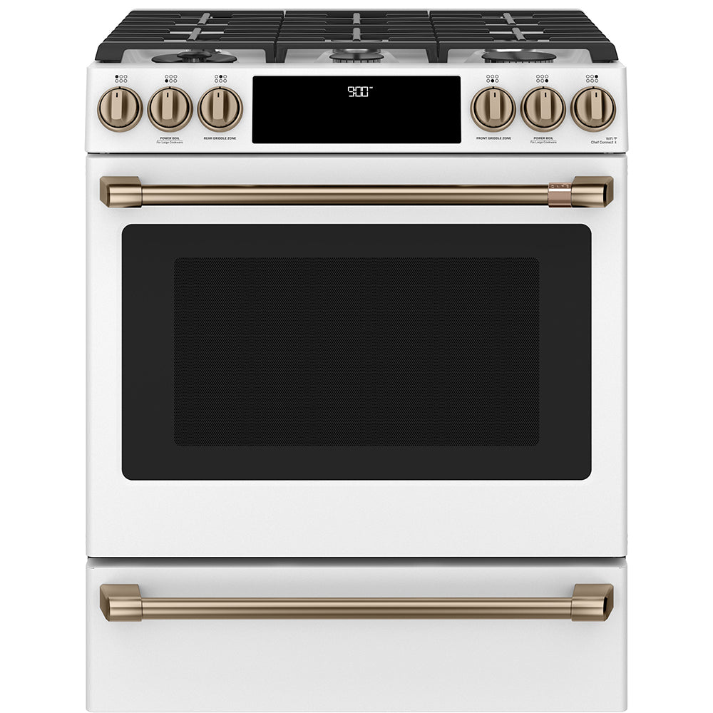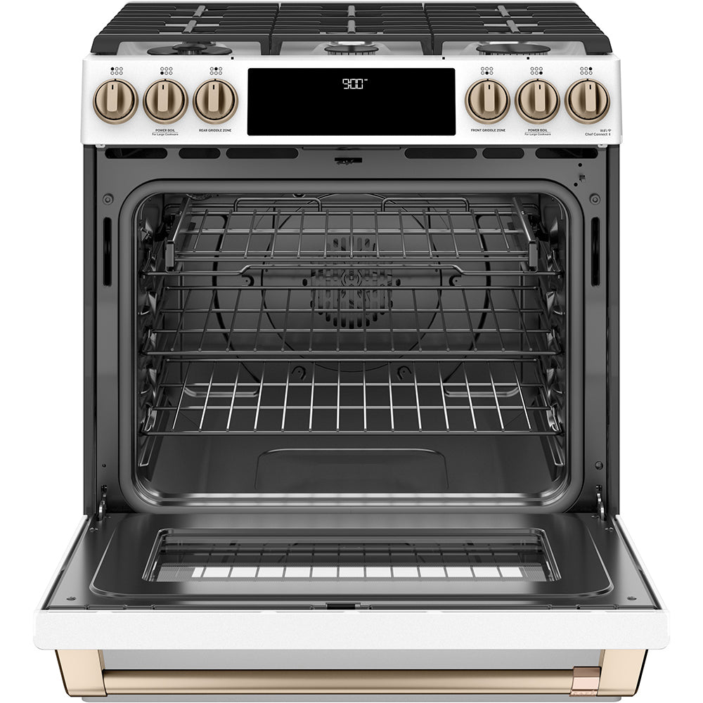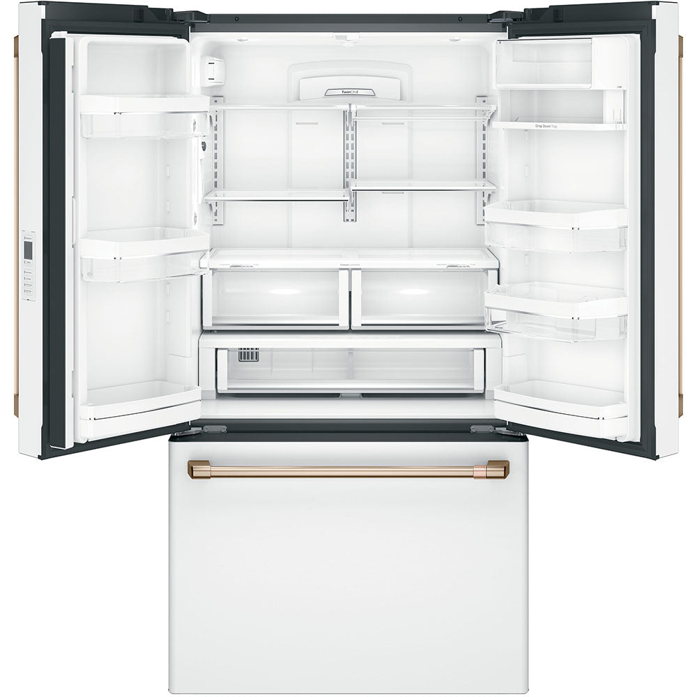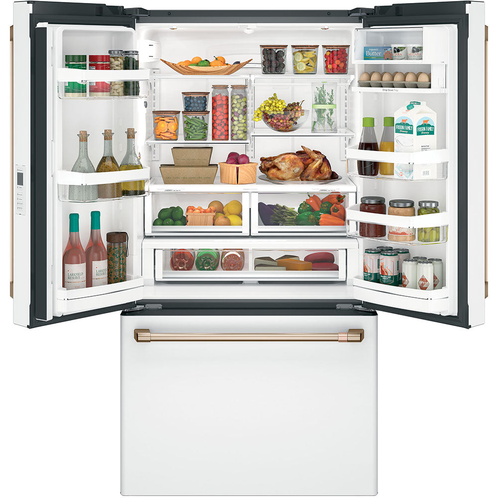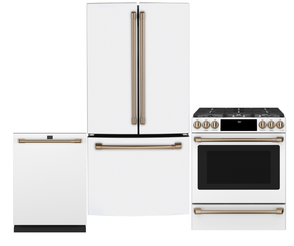 GE Cafe 36" Counter Depth French Door Refrigerator - Slide in Gas Range - Dishwasher Set Package Includes Café™ Energy Star® 23.1 Cu. Ft. Counter-Depth French-Door Refrigerator - CWE23SP4MW2 Café™ 30'' Slide-In Front Control Gas Oven with Convection Range Matte White - CCGS700P4MW2 Café™ Stainless Interior Built-In Dishwasher with Hidden Controls Matte...