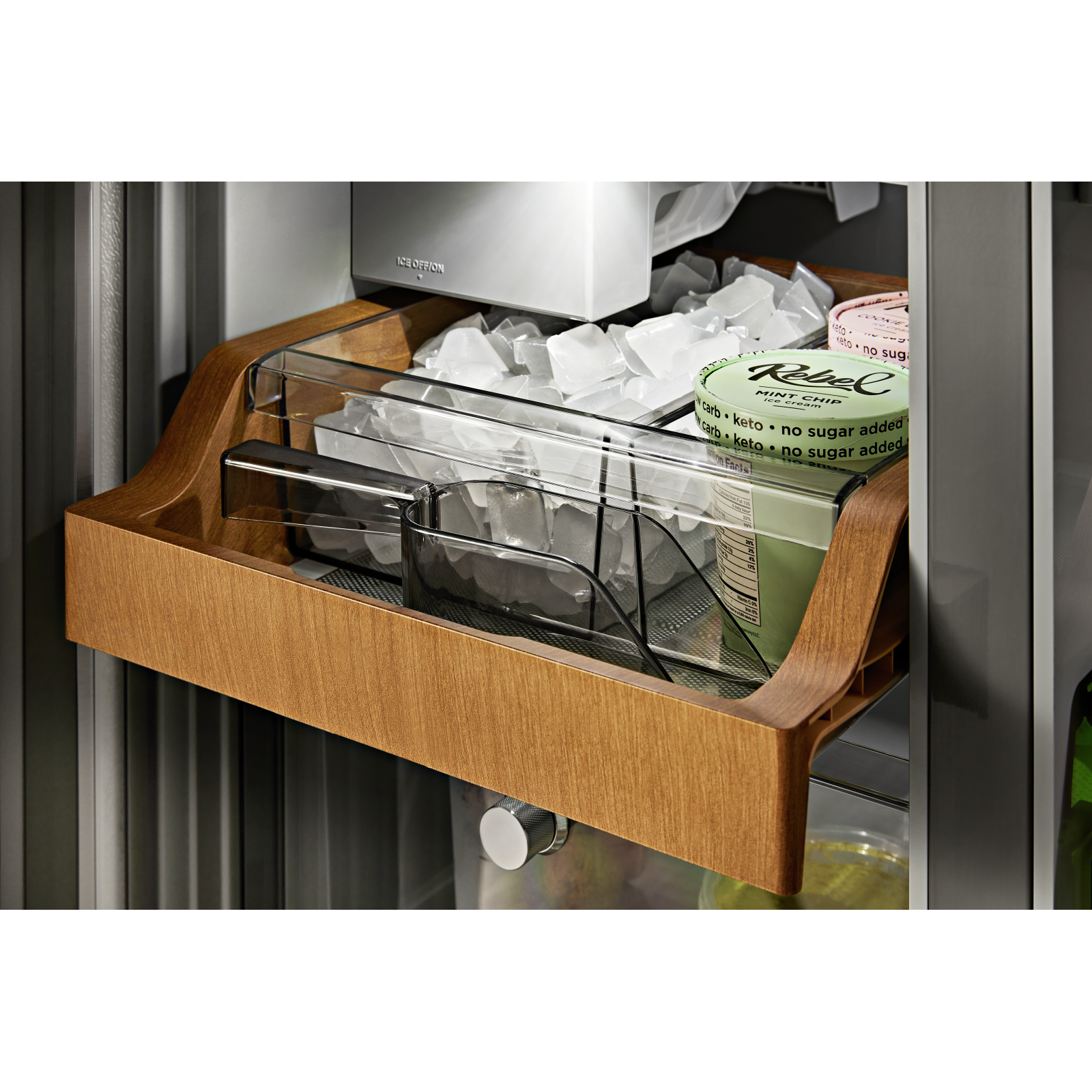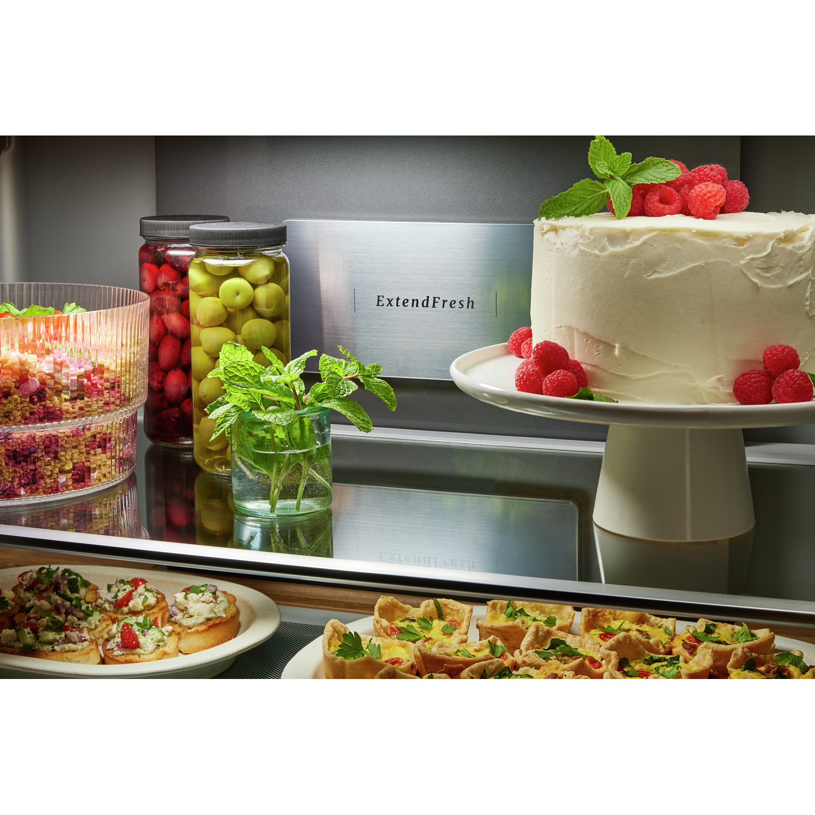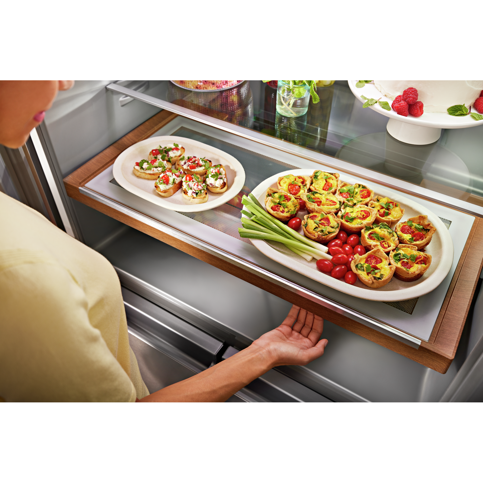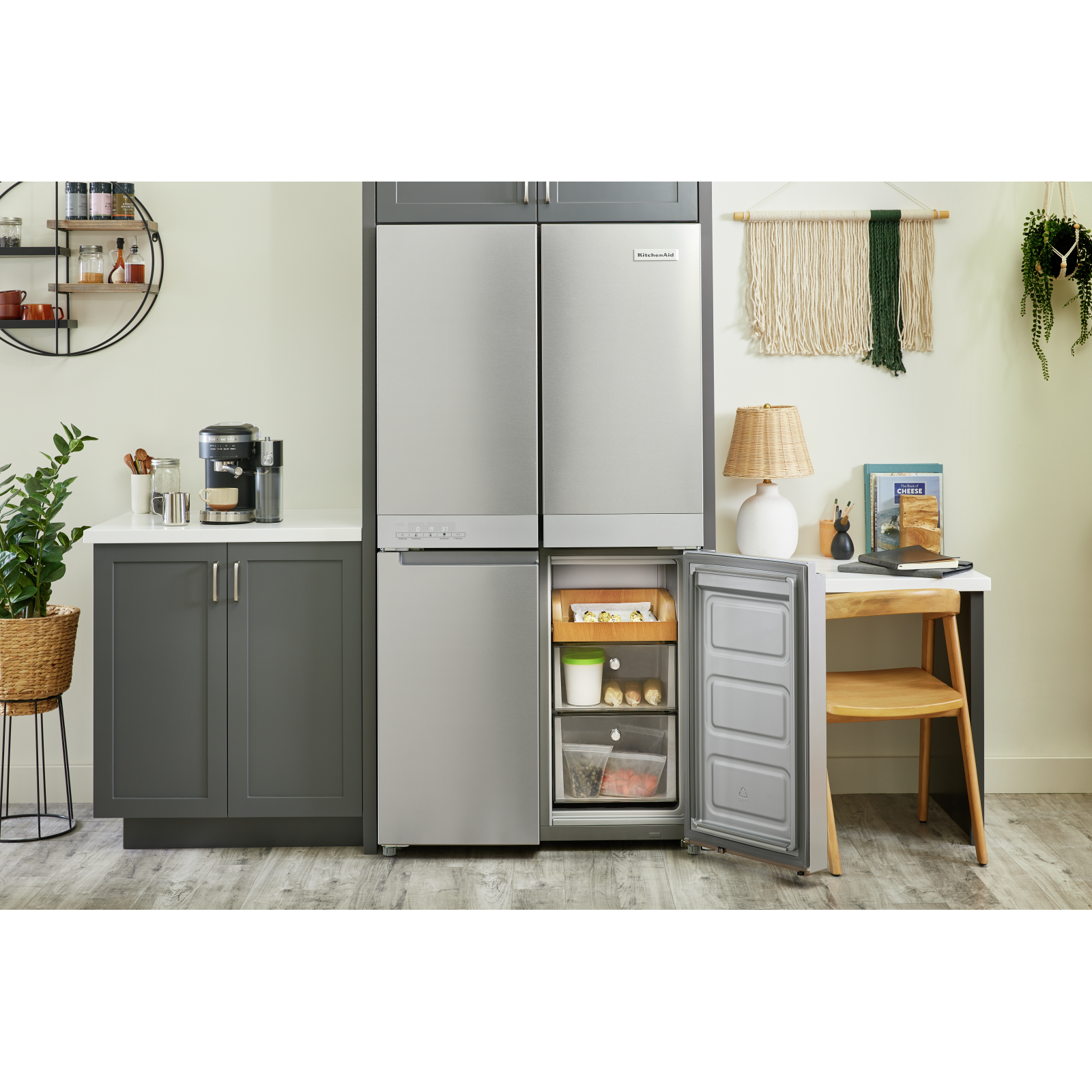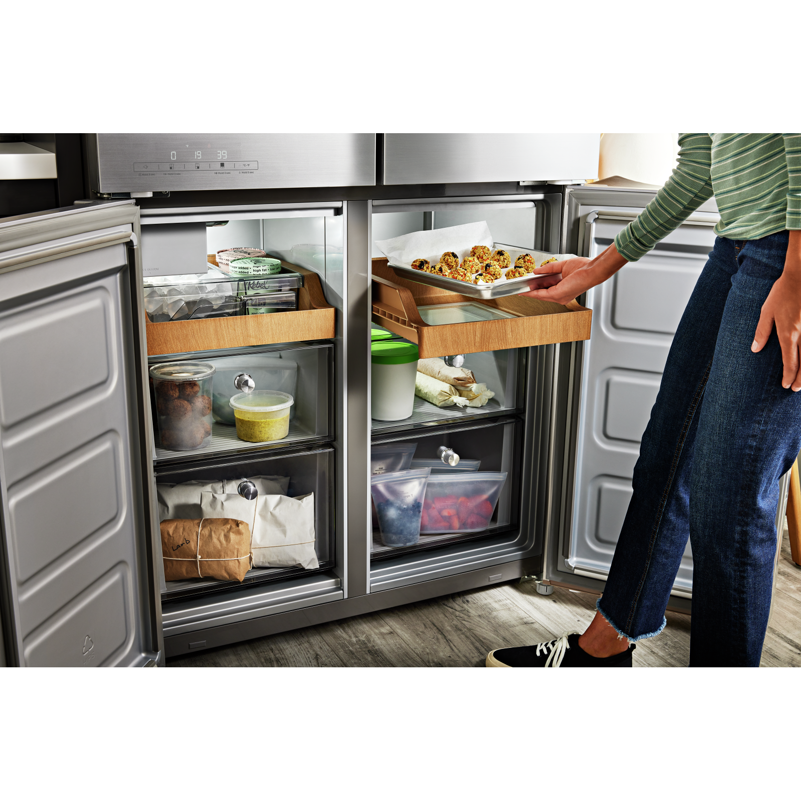 36-inch Wide Counter-Depth 4-Door Refrigerator with PrintShield™ Finish has a modern configuration that helps keep ingredients fresh and accessible, with the premium sliding storage trays in the refrigerator and freezer. The Custom Freeze Zone allows cooks to select 0F, 10F or 19F, ideal for storing items such as compound butters...