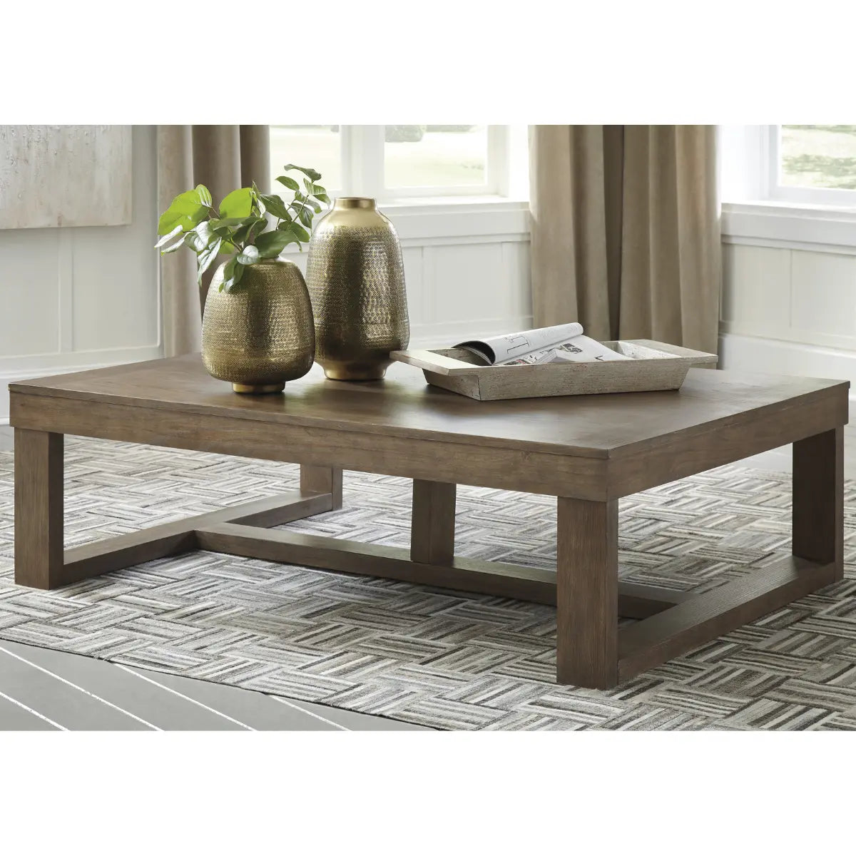 Oversized yet far from overdone, this designer coffee table masters the art of simplicity. Bold, blocky profile is enriched with plank-effect styling and a textured grayish brown finish for a look that’s cool and contemporary and a vibe that’s warm and inviting. Its generous scale makes it a natural complement...