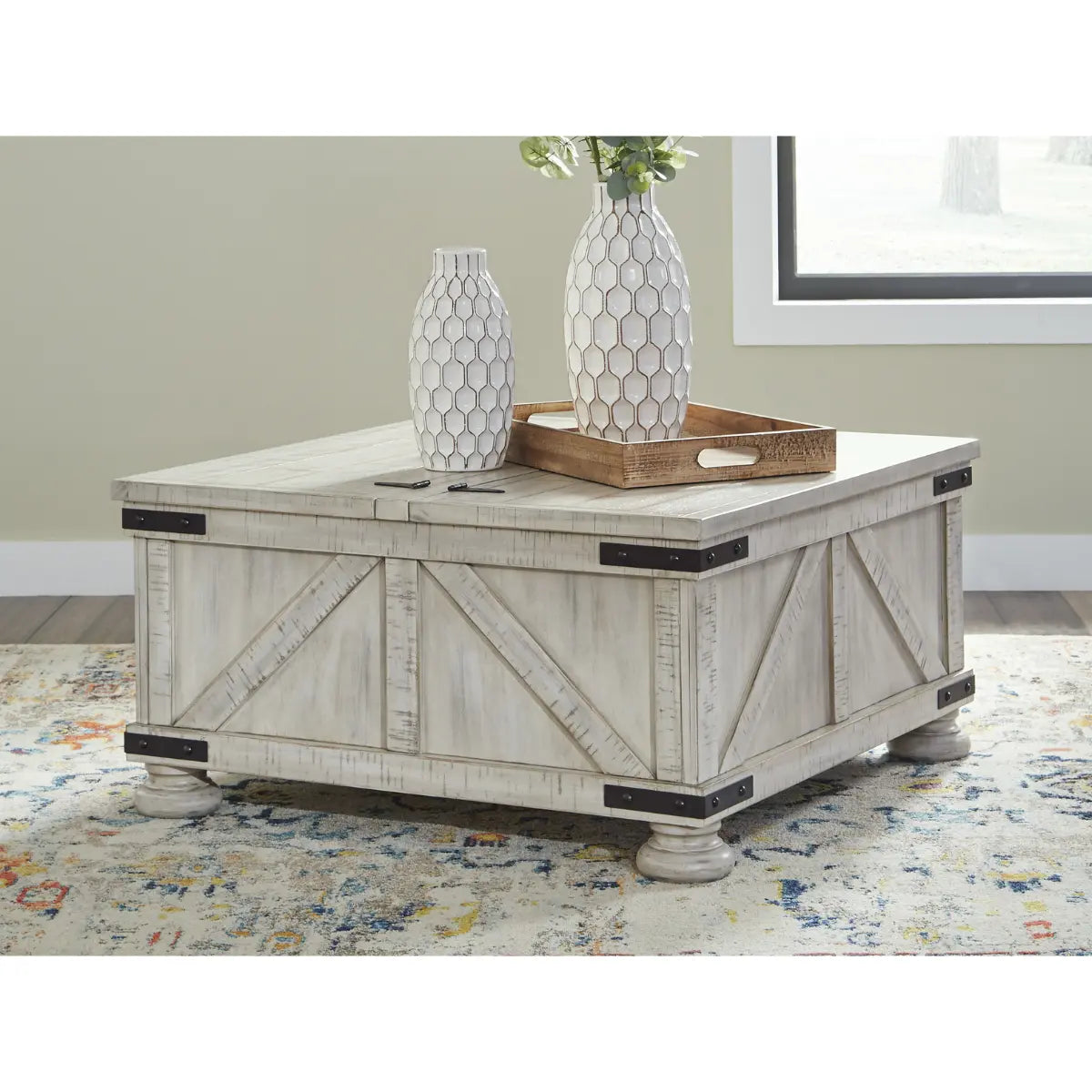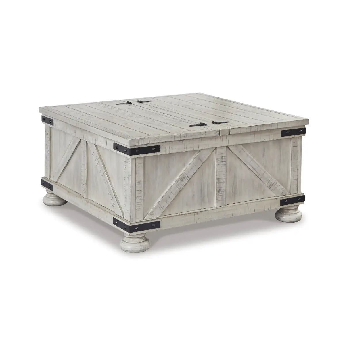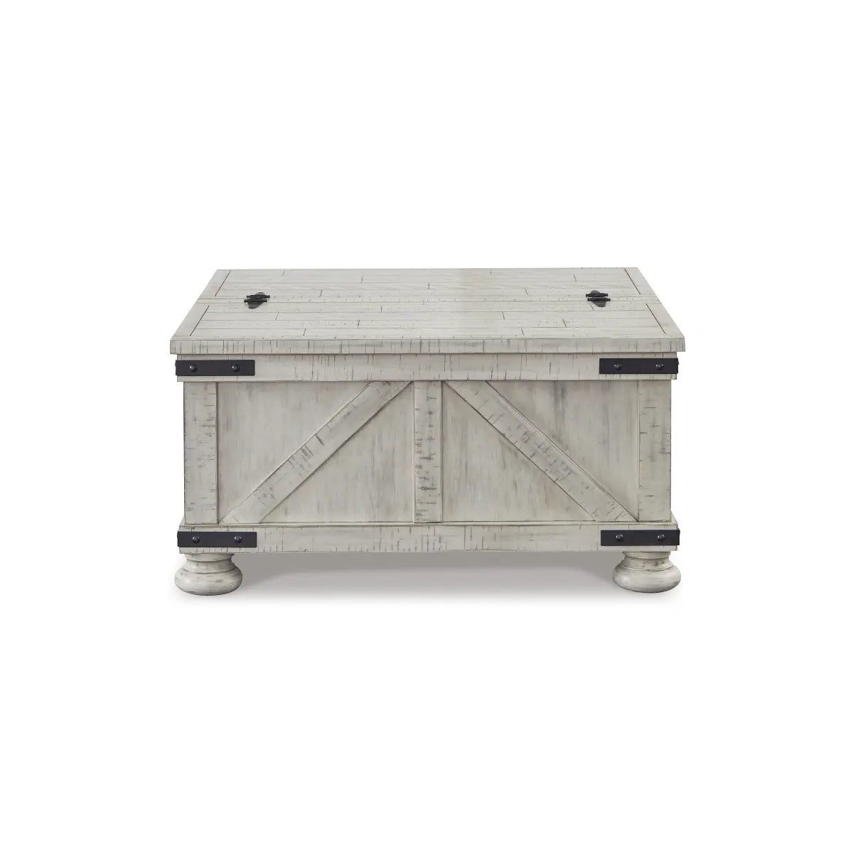 Double up on form and function with this square coffee table with storage. Its dual-lid tabletop provides easy access to the roomy storage space. Crafted with a distressed whitewash finish, crossbuck detailing and metal bracket appliques, this generously scaled coffee table is rustic farmhouse living at its best. Features:  Made...