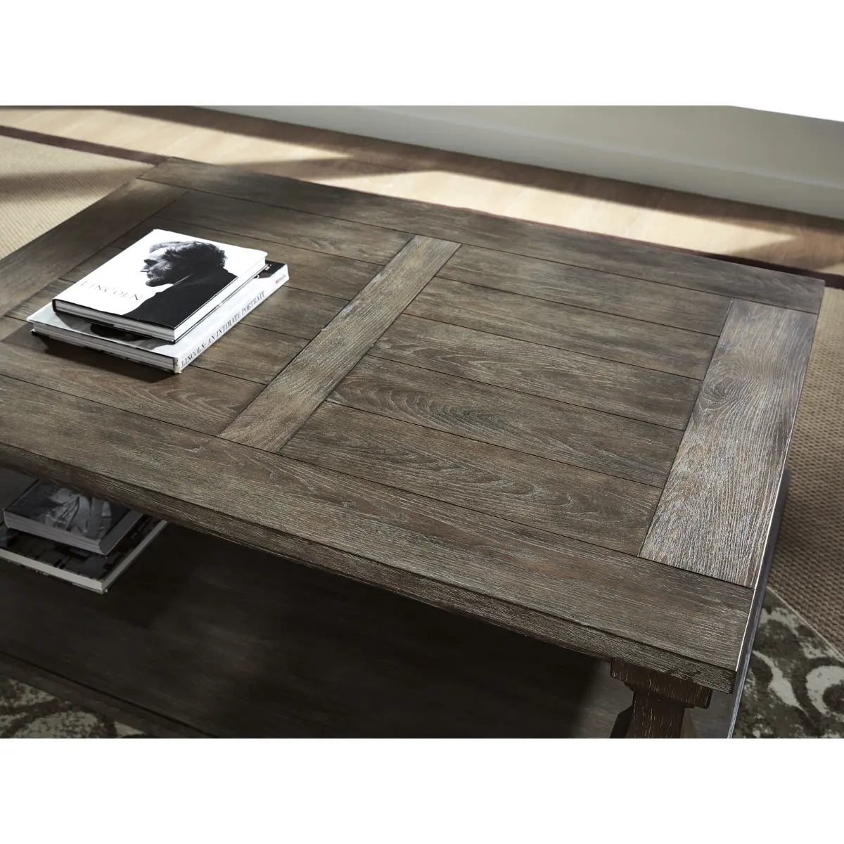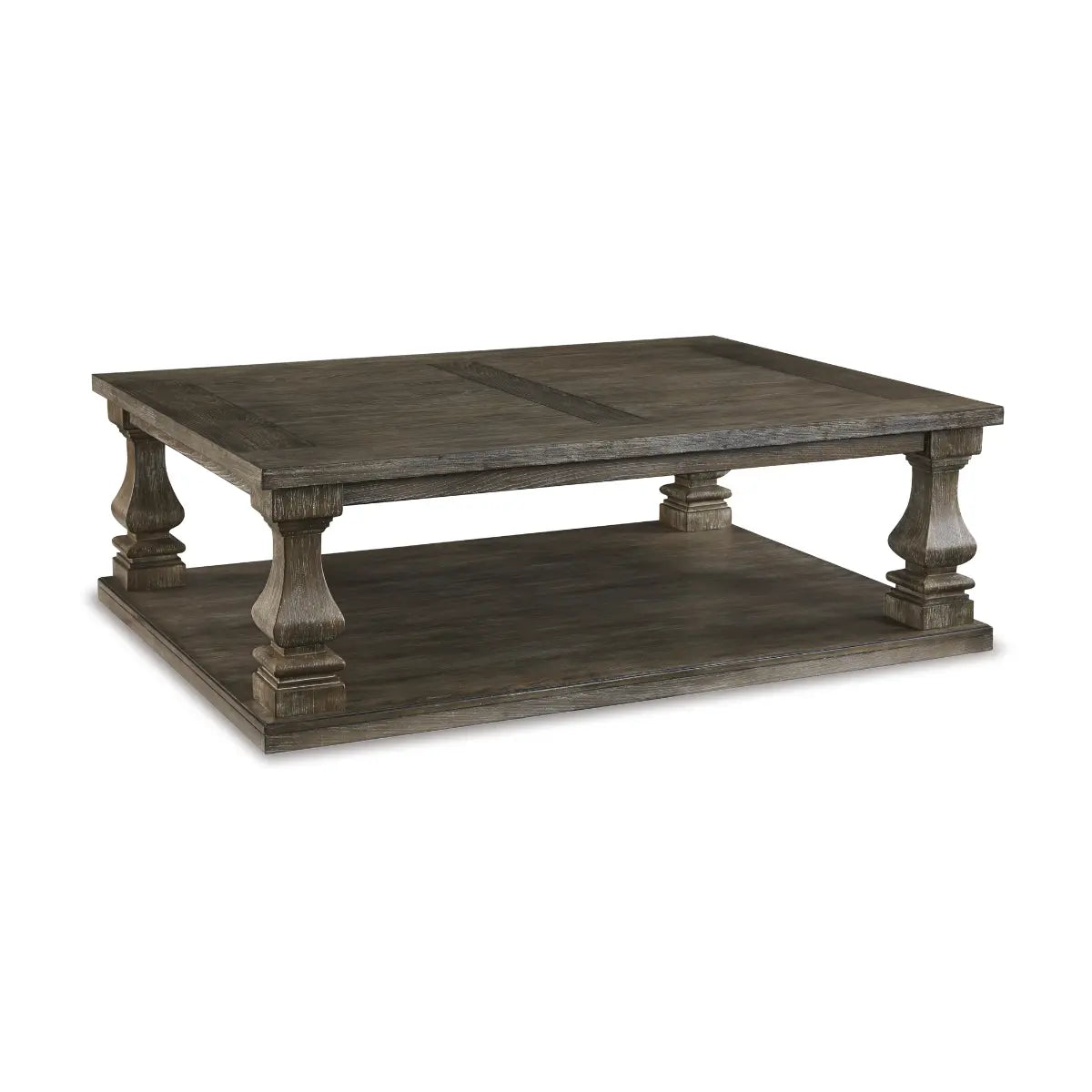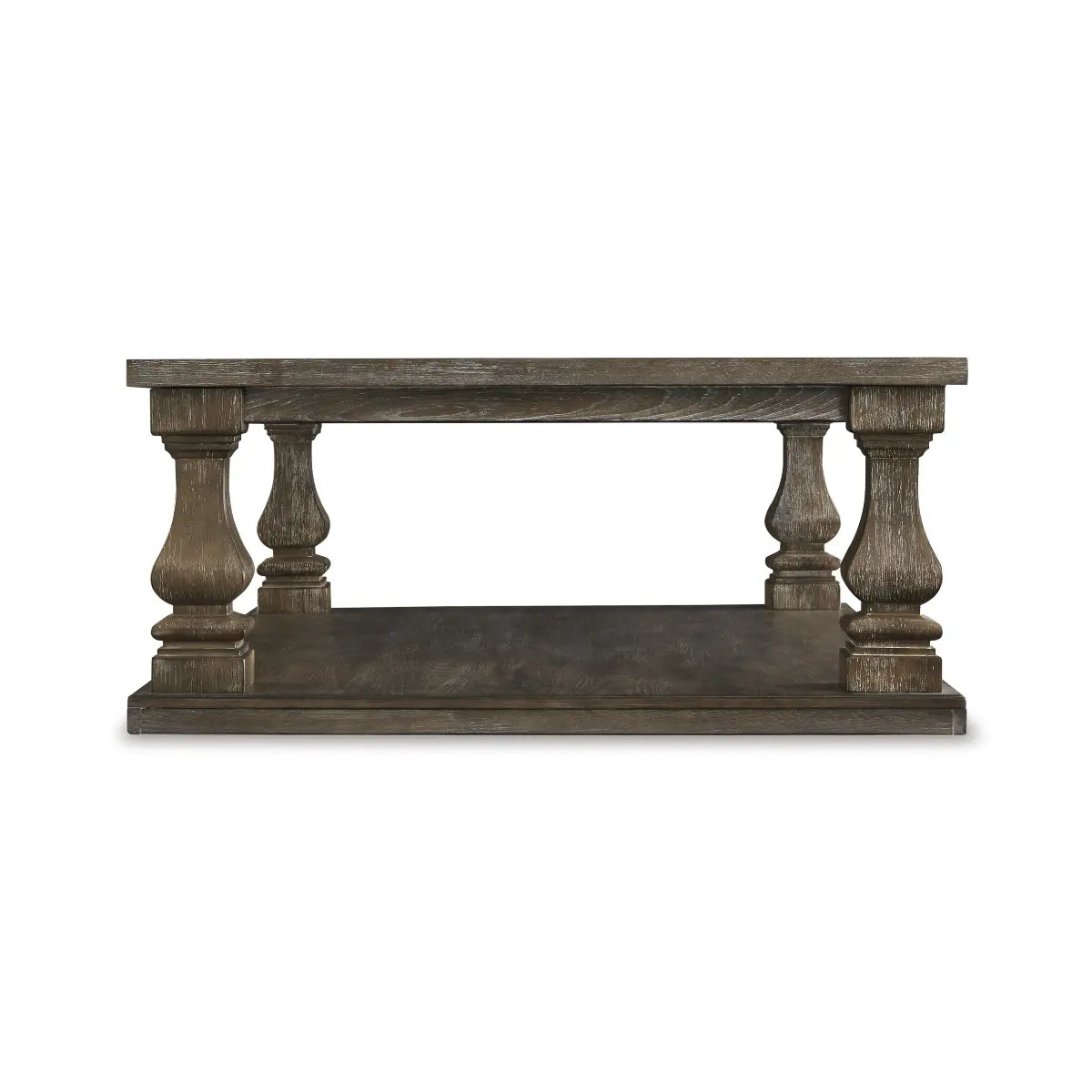 Homey. Hearty. Heavenly hued. Luring with a distressed weathered gray finish and square baluster legs set on a broad lower shelf for great presence, this coffee table is sure to make your homestead feel that much more like home. The look is beautified with elm veneers and a framed and...