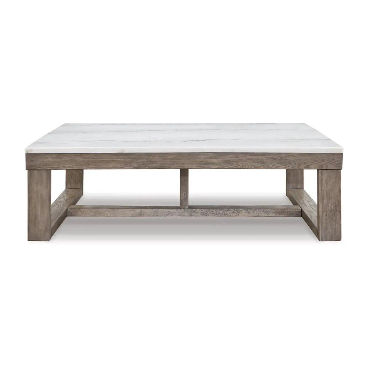 This coffee table is simple in design but big on style. Finished with a trend-right grayish brown wood tone, its bold, blocky profile and natural marble top are timeless classic choices that work so well with large sectional family room settings. Adding to its beauty, the marble top's color variations,...