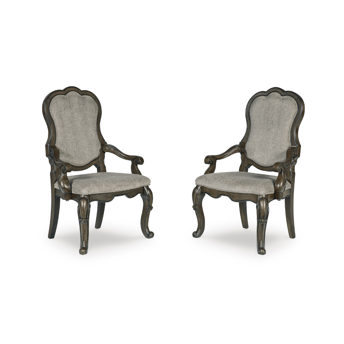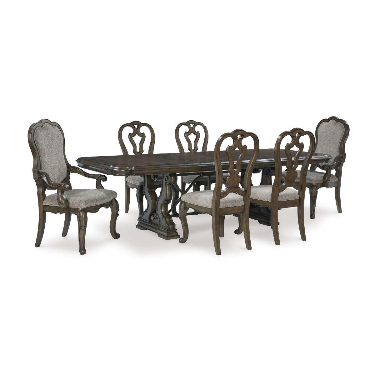 From its ornamental appliques to its large scale, this dining package makes a bold statement. With ornate details, the opulent set wows with stunning style. The look is timeless. The feel? Right at home. Dining Extension Table: Made with hardwood solids, oak and ash swirl veneers, MDF substrates and cast...
