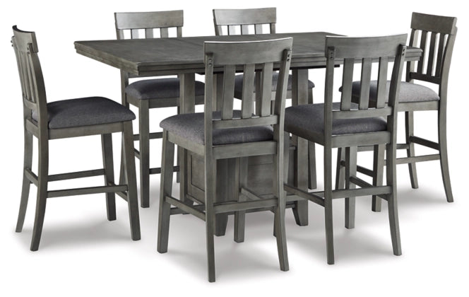 Description Features Specifications Cool and on-trend. This counter-height dining package sports an antiqued gray finish and gray textural fabric for a contemporary-yet-casual feel. The table features a storage base and removable leaf for extra seating room, making it a breeze to clear off clutter and expand your table space. Comfortably...