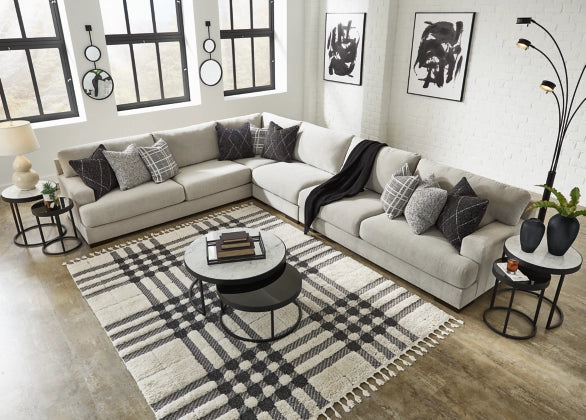 Description Features Specifications This sectional is a beautiful case of oversized space—fully utilized. Its generous scale ensures that everyone has a place to kick back and relax in style. Stunning in light gray, its cool color is only part of the story, a bevy of black and white accent pillows...