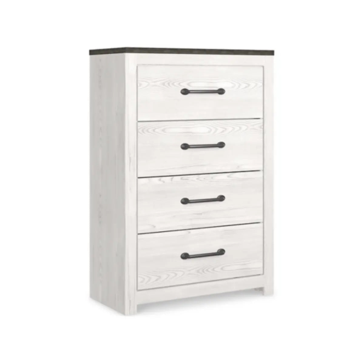 Cool, clean and casually modern. This chest’s wispy whitewash and gray finish sets the tone for your calming sanctuary. Large linear pulls add dimension and authenticity. Four smooth-gliding drawers neatly accommodate your wardrobe needs. Made of engineered wood (MDF/particleboard) and decorative laminate White rustic finish with replicated cedar grain Rustic...
