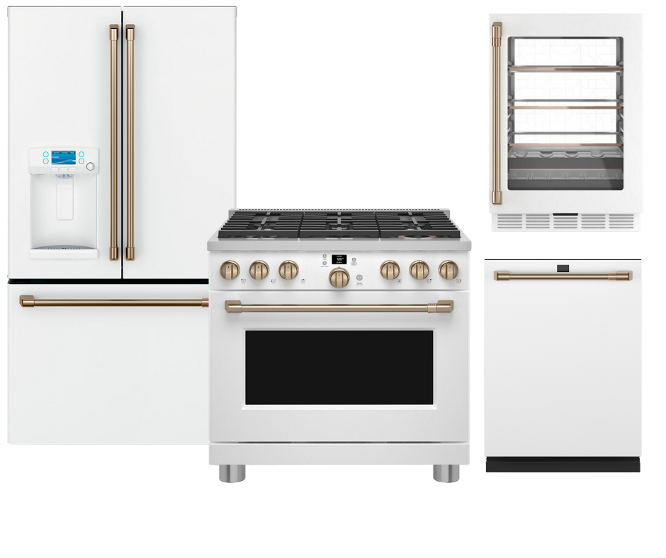 This Package includes   Café 36" Counter Depth Fridge with 36" Stove - Dishwasher and Beverage Center Café™ 22.2 Cu. Ft. Counter-Depth French-Door Refrigerator with Hot Water Dispenser Matte White - CYE22TP4MW2 Café 4.7 cu ft Wine Chiller Matte White- CCP06DP4PW2 Café 36" Smart Dual-Fuel Range with No-Preheat Air Fry...