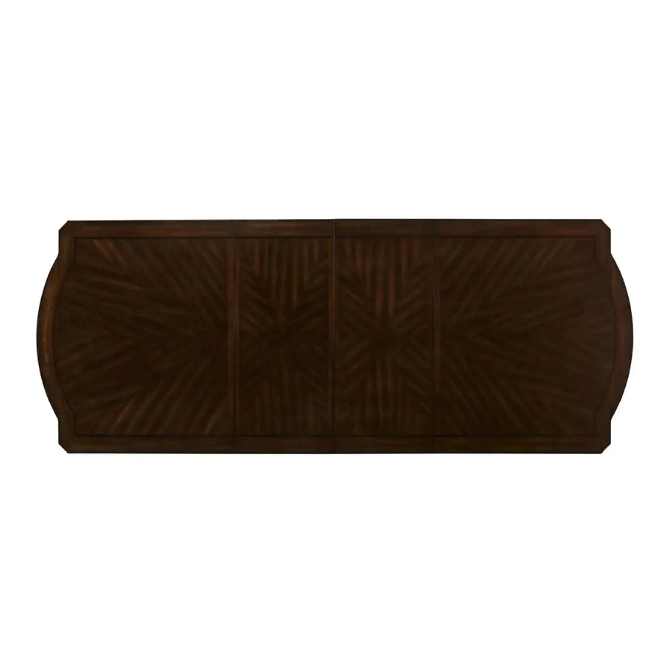 Subtle influence for the design of the Delavan dining table is drawn from the classic look of Art Deco styling. The flared pedestal table base ascends to support the bookmatched veneer table-top with extending leaf, dramatically detailed in a starburst pattern with rich shading from dark to light. The rich...