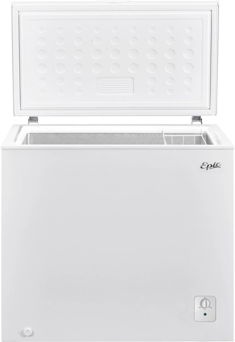 Description Features Specifications The family sized Epic 7 cu.ft. Manual defrost chest freezer gives you the ability to maximize storage and organization of your favourite frozen foods. This clean white chest freezer features a defrost drain, 1 white coated wire freezer basket, adjustable thermostat and power indicator light. Large 7.1...