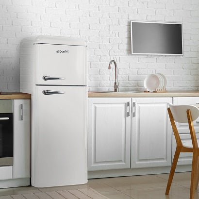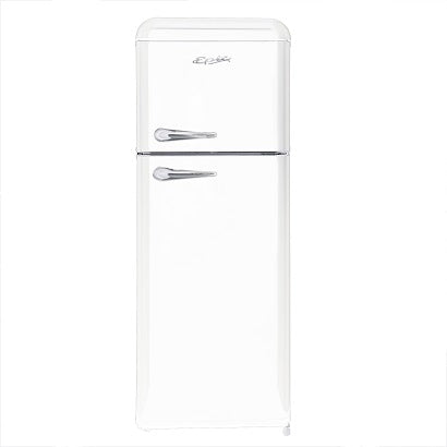 Description Features Specifications Retro flashback with this Epic 7.5 cu.ft. White Refrigerator/Freezer. Features include 2 tempered glass adjustable shelves, separate freezer section with removable shelf, Automatic Defrost Refrigerator and Manual defrost freezer section keep food fresh, adjustable door storage and full size vegetable crisper with glass cover. Classic Retro Gloss...