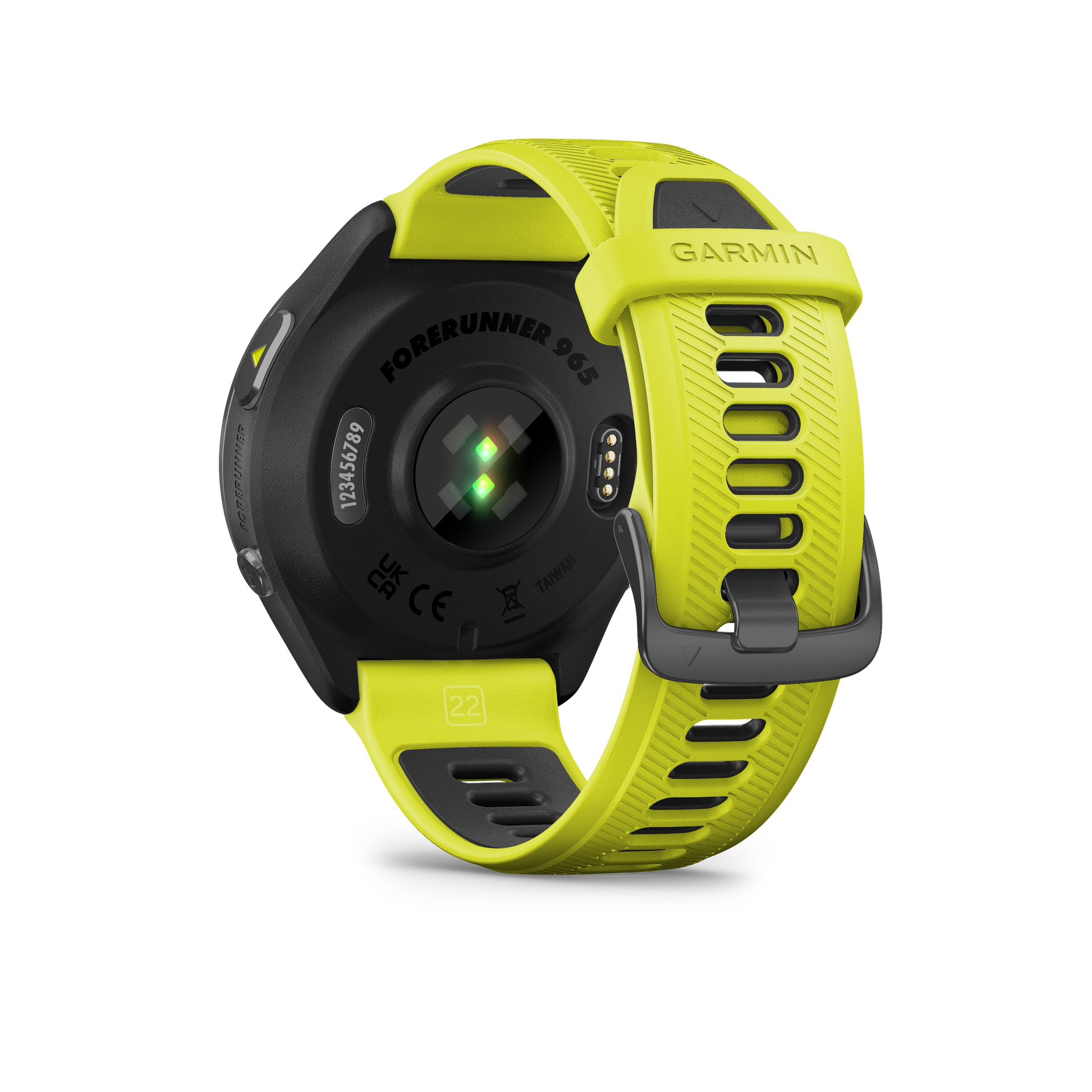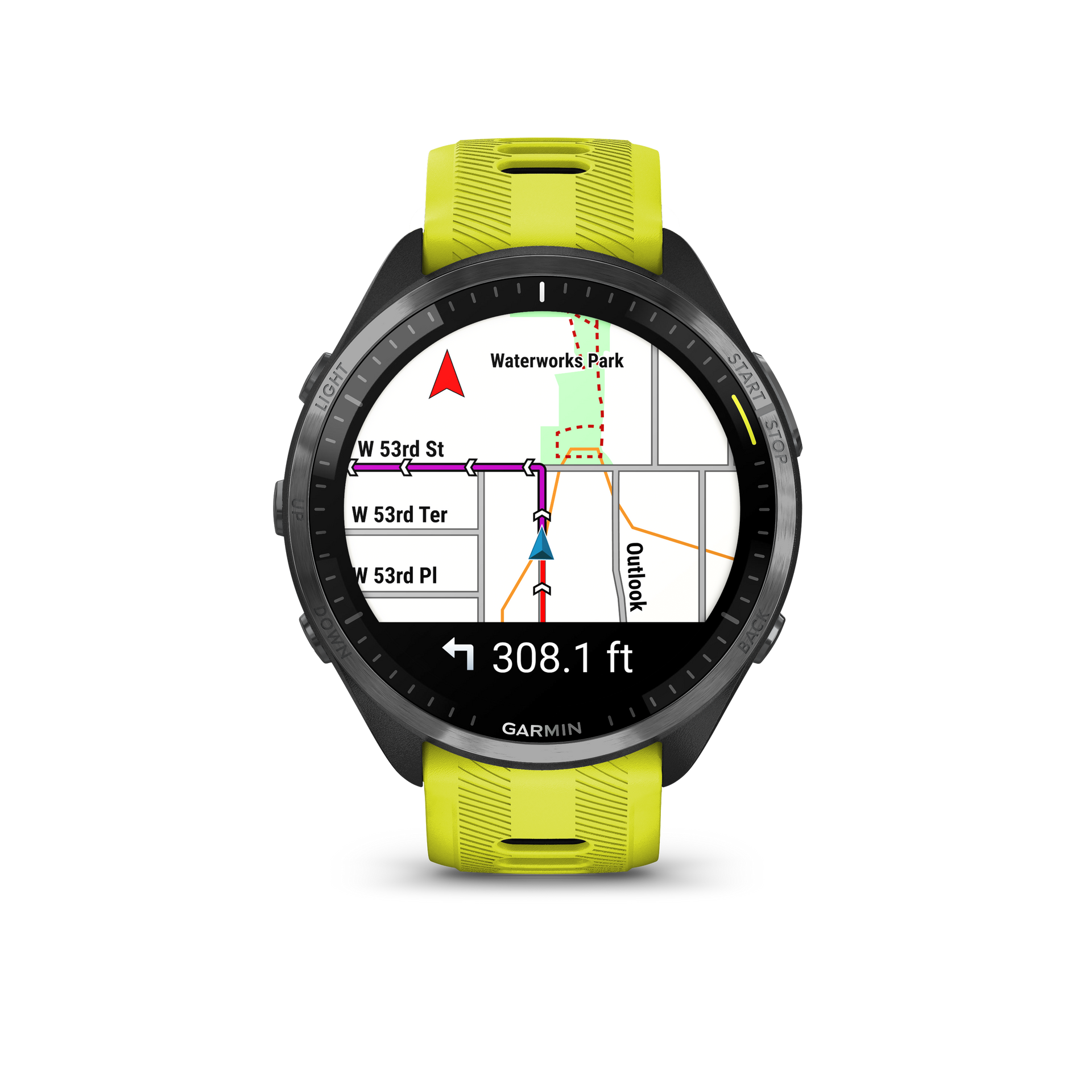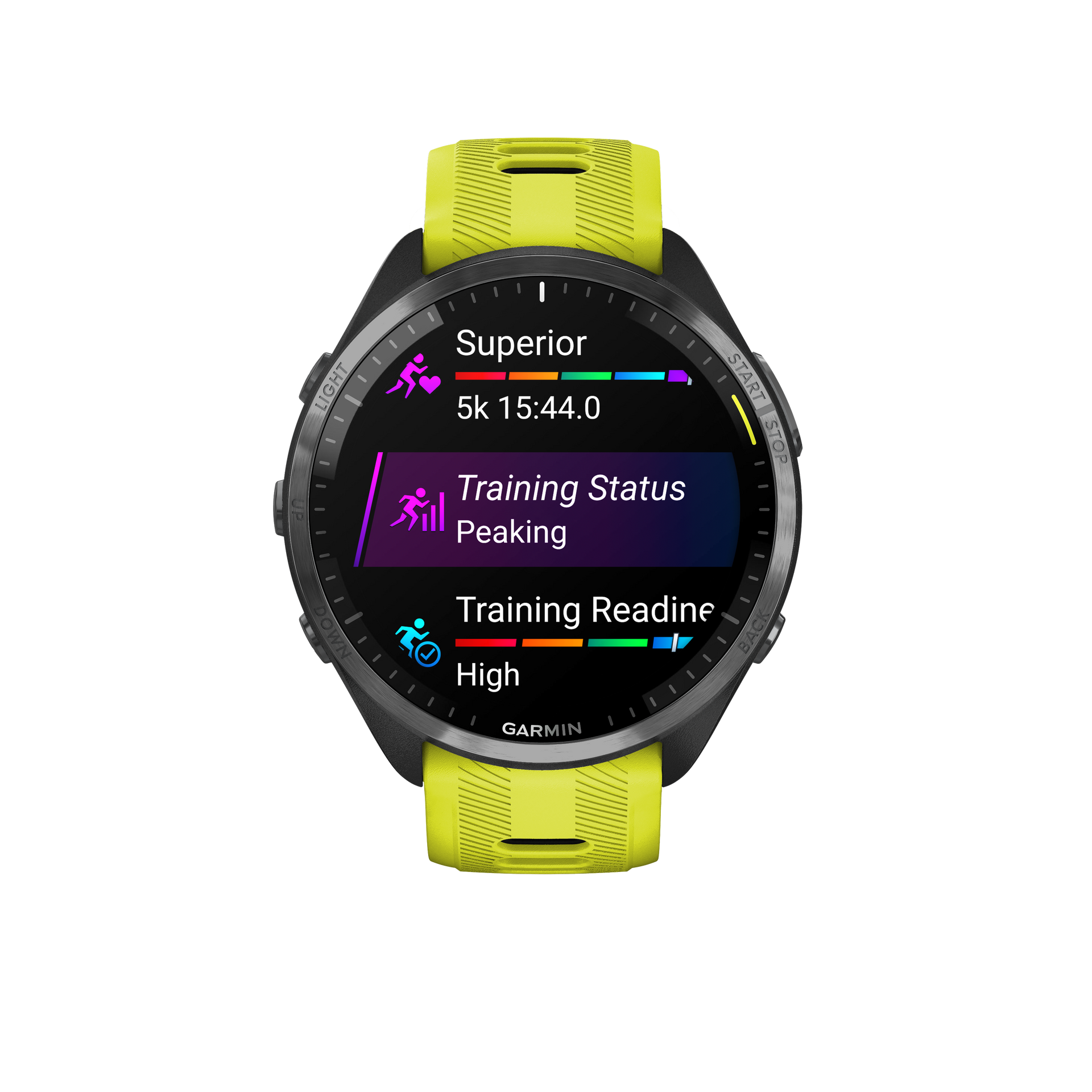 Train brilliantly with Forerunner® 965, the premium GPS running and triathlon smartwatch with a bright AMOLED touchscreen display and lightweight titanium bezel. Wake up to your morning report with HRV status to see health insights with an overview of sleep, recovery and training outlook (data presented is intended to be a close estimation of metrics tracked). The training readiness feature tells you when you’re primed for a productive session — while daily suggested workouts adapt to performance and recovery alongside the race widget, which provides training tips, course details and completion time predictions. Navigate any route confidently with multi-band GPS and full-color, built-in maps. With traditional buttons and a touchscreen display, it’s easy to tap into your training status and know whether you’re training productively, peaking or strained. If you’re pushing to outshine the competition, the Forerunner 965 is there to light up every run with up to 23 days of battery life in smartwatch mode.