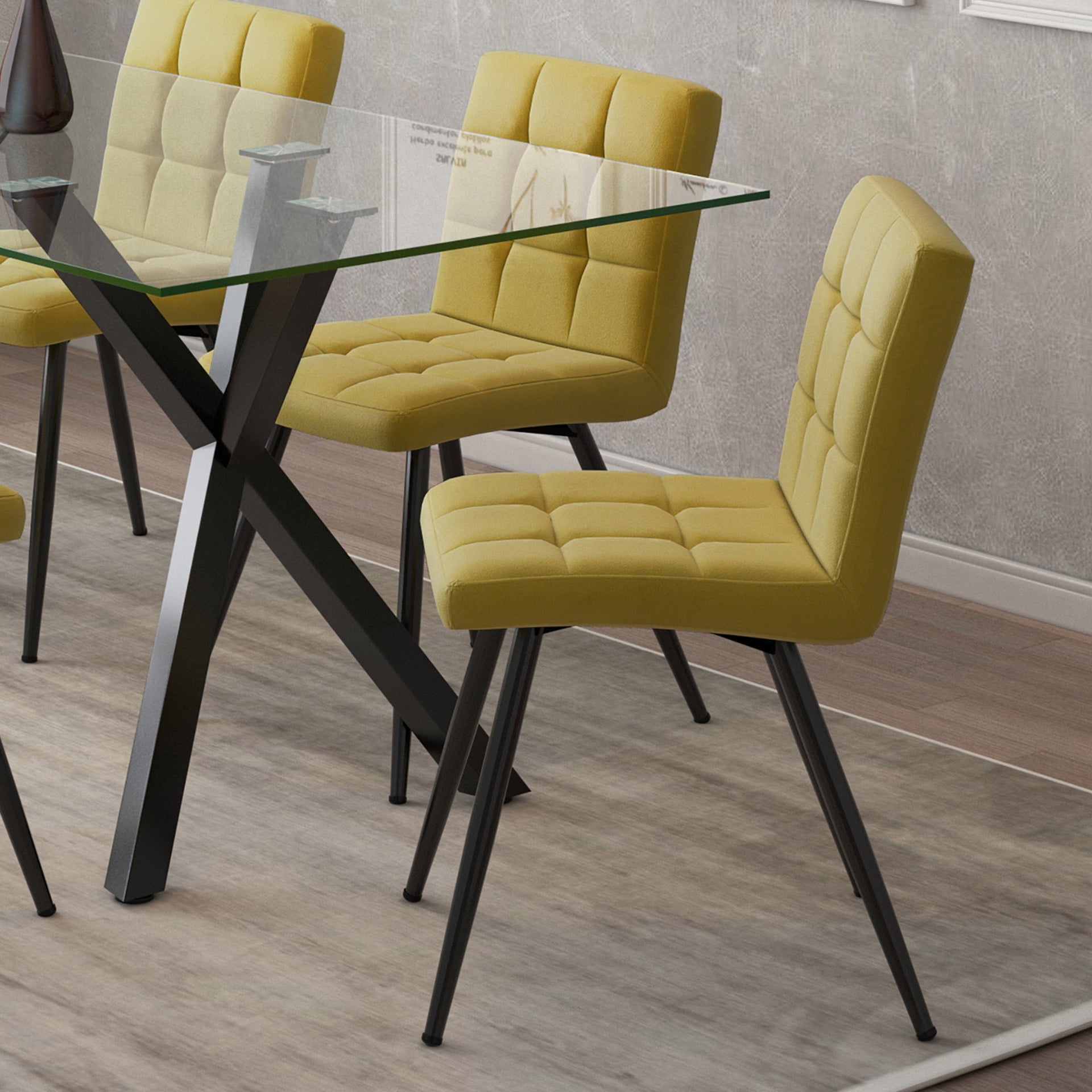 Description Features Specifications Cute and contemporary, these velvet-upholstered dining chairs will elevate the style factor in your space. Smaller scaled chairs are great for tighter spaces, but the tufted cushions on the back and seat means there is no sacrificing on comfort. Fun pops of colour will brighten up the...