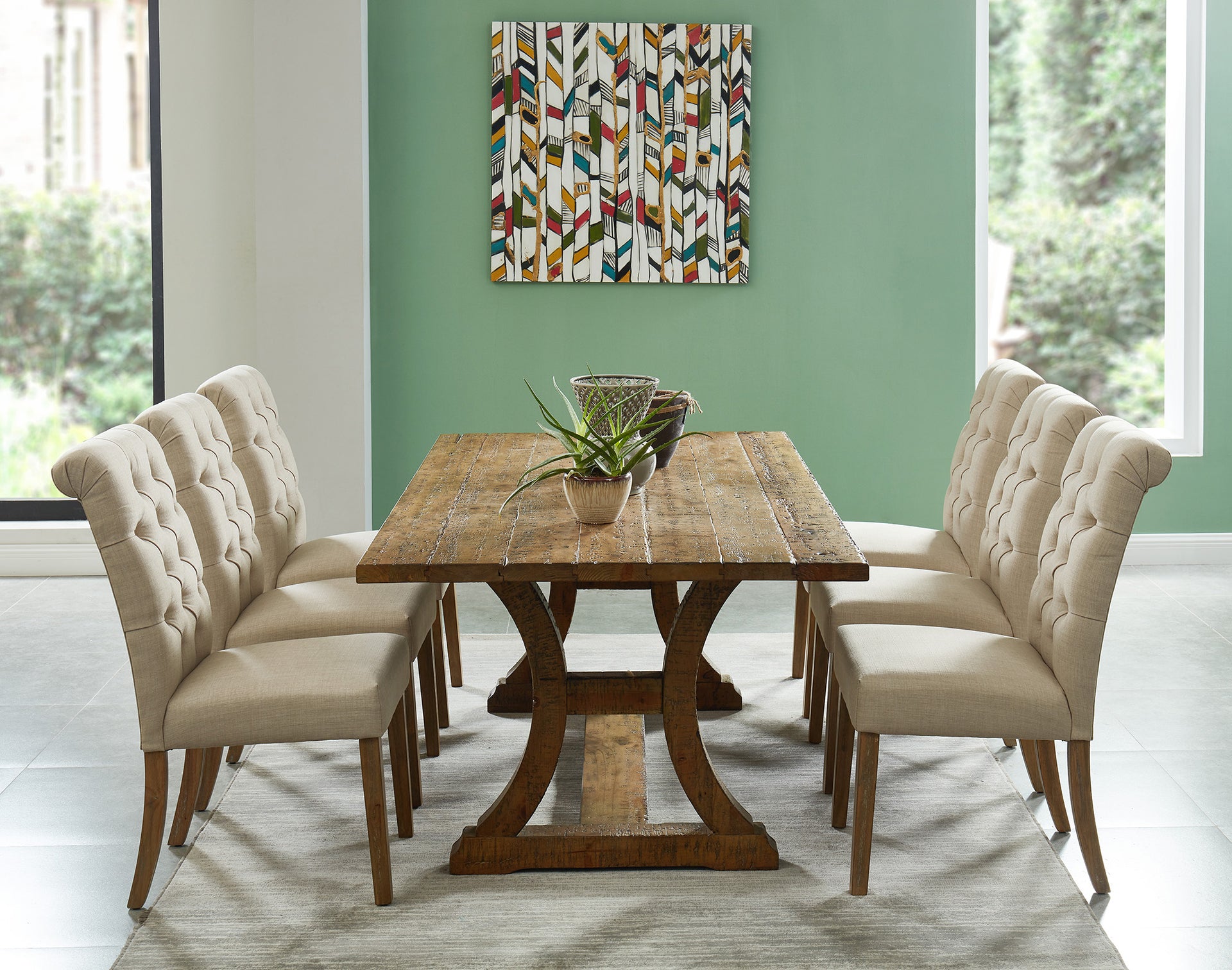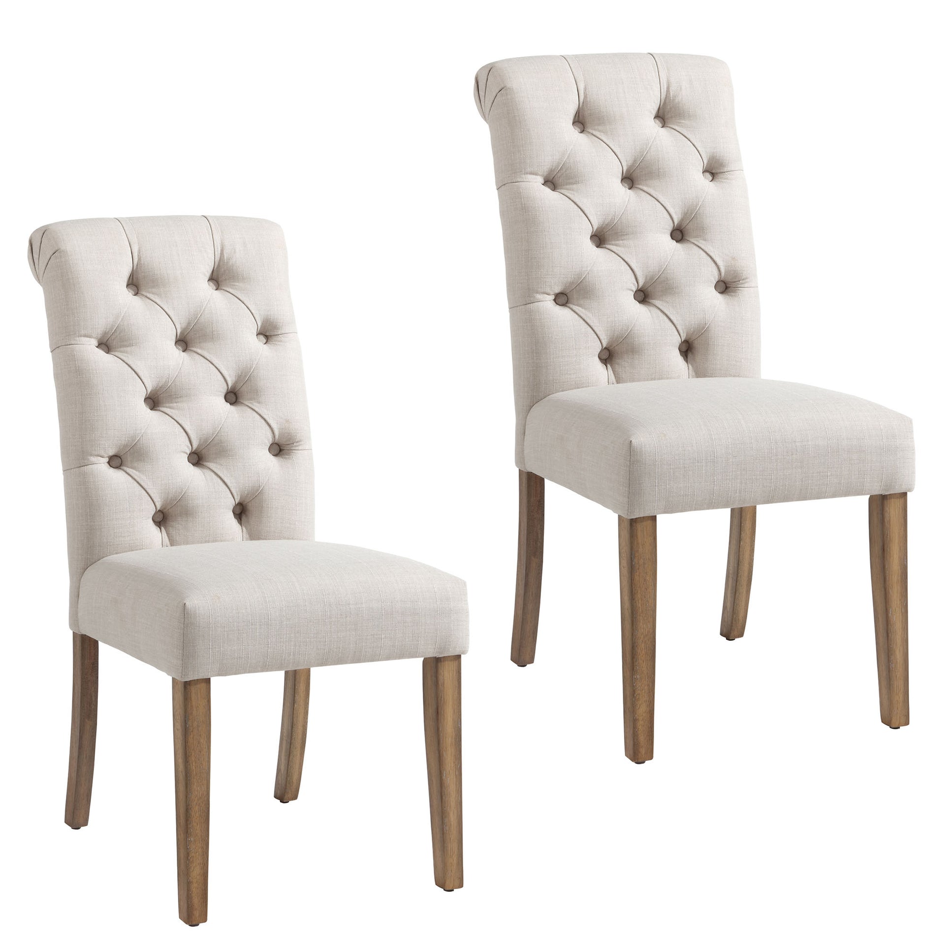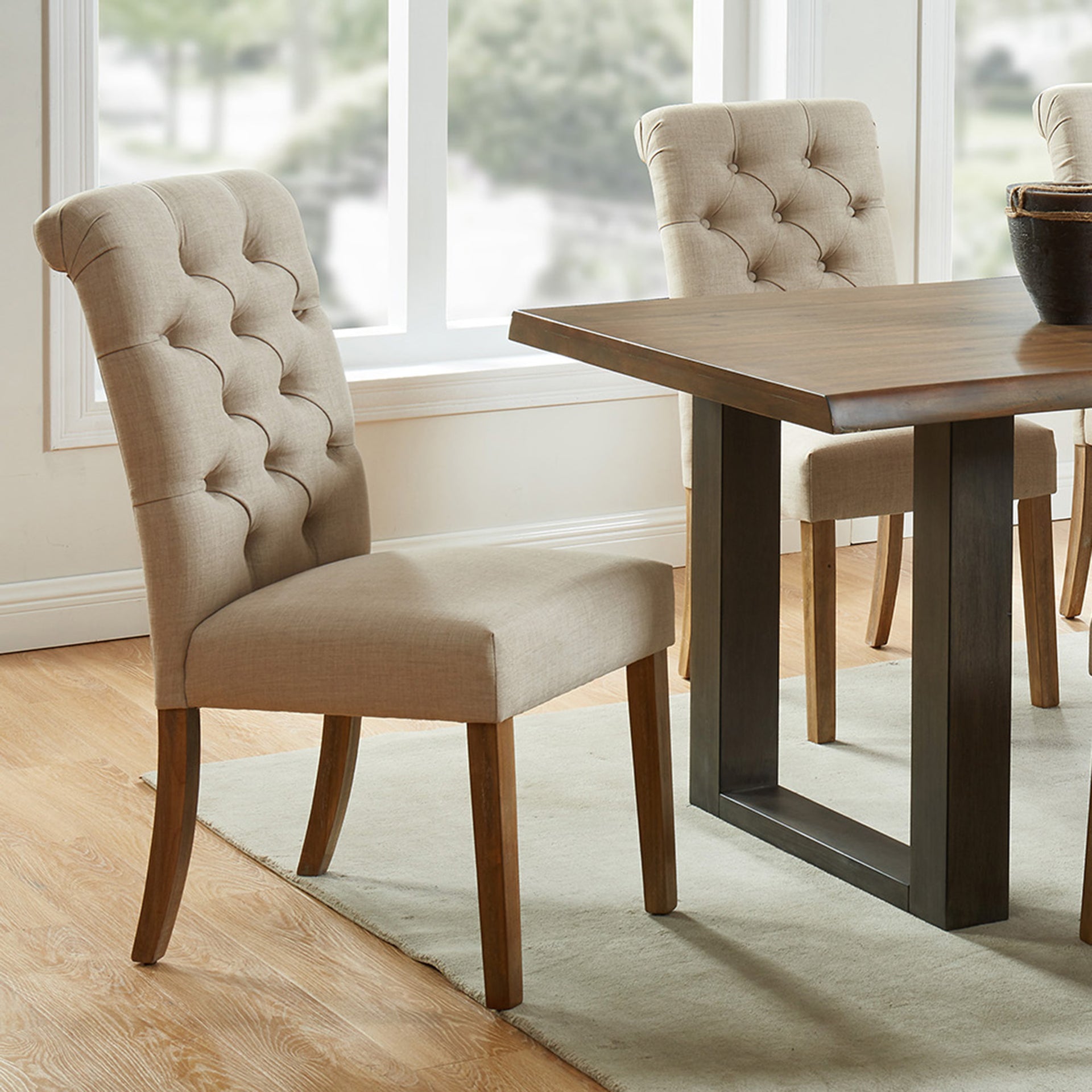 Description Features Specifications This tufted beauty oozes class and sophistication! The comfortable, cushioned seat and back, the rolled detail on the back, the textured upholstery, all combine to create the perfect chair for your dining room. The gorgeous beige fabric, and the vintage, washed oak finish on the legs will...