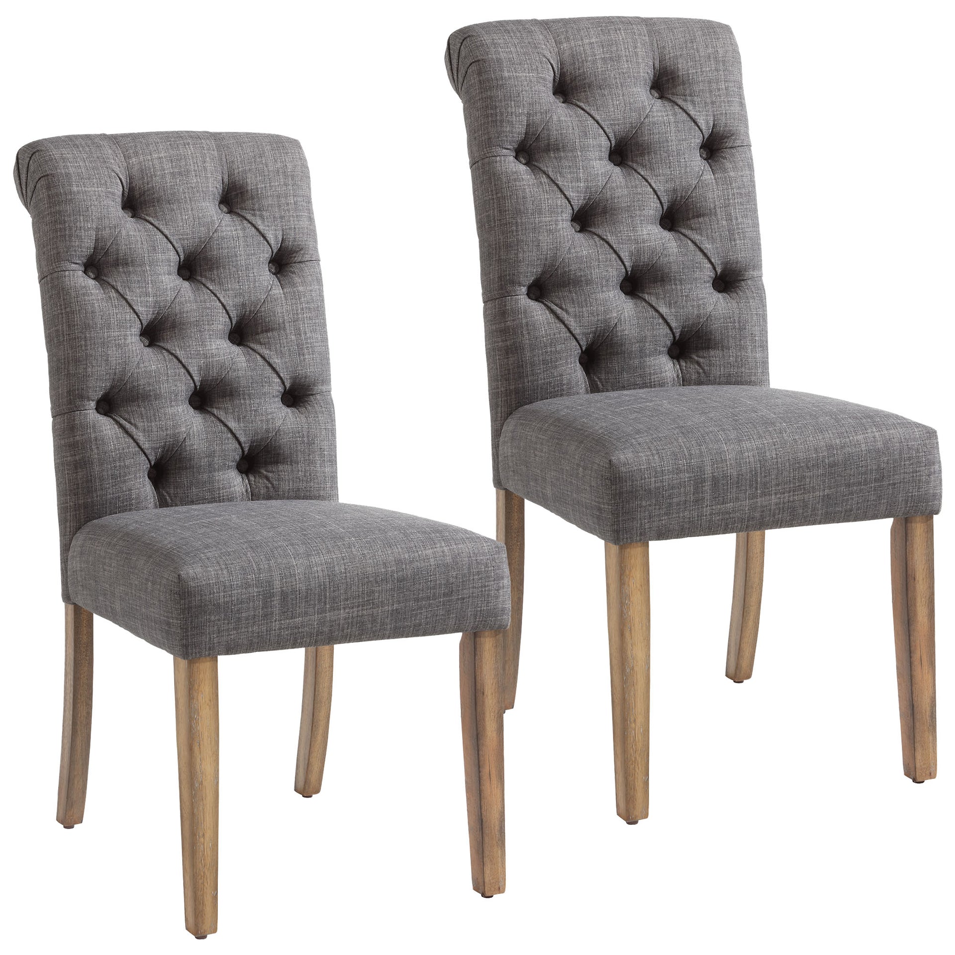 Description Features Specifications This tufted beauty oozes class and sophistication! The comfortable, cushioned seat and back, the rolled detail on the back, the textured upholstery, all combine to create the perfect chair for your dining room. The gorgeous grey fabric, and the vintage, washed oak finish on the legs will...