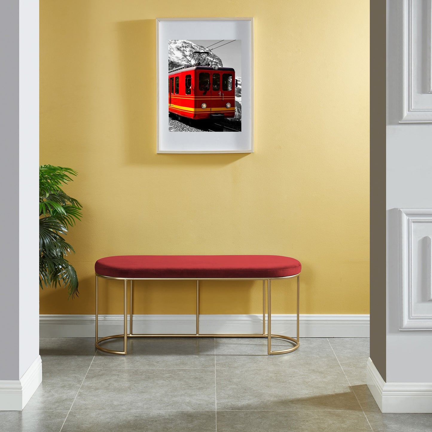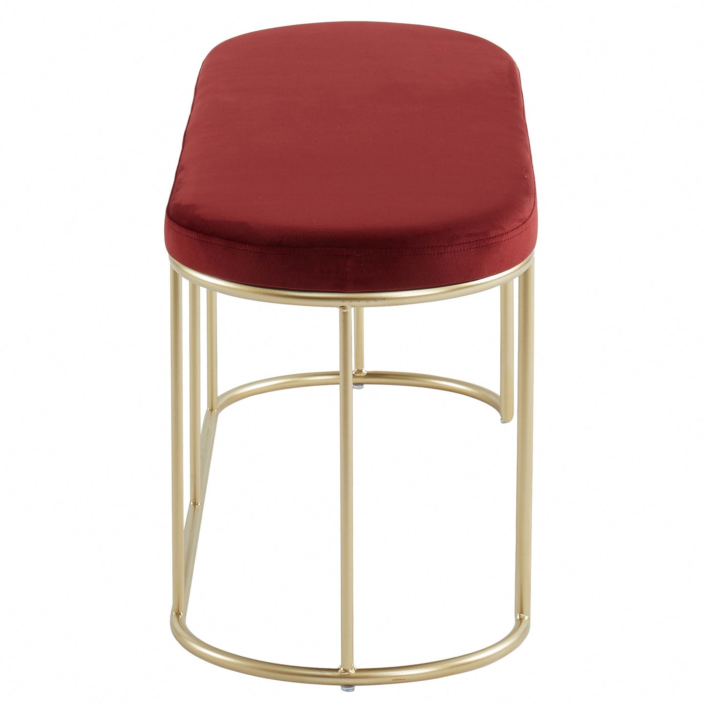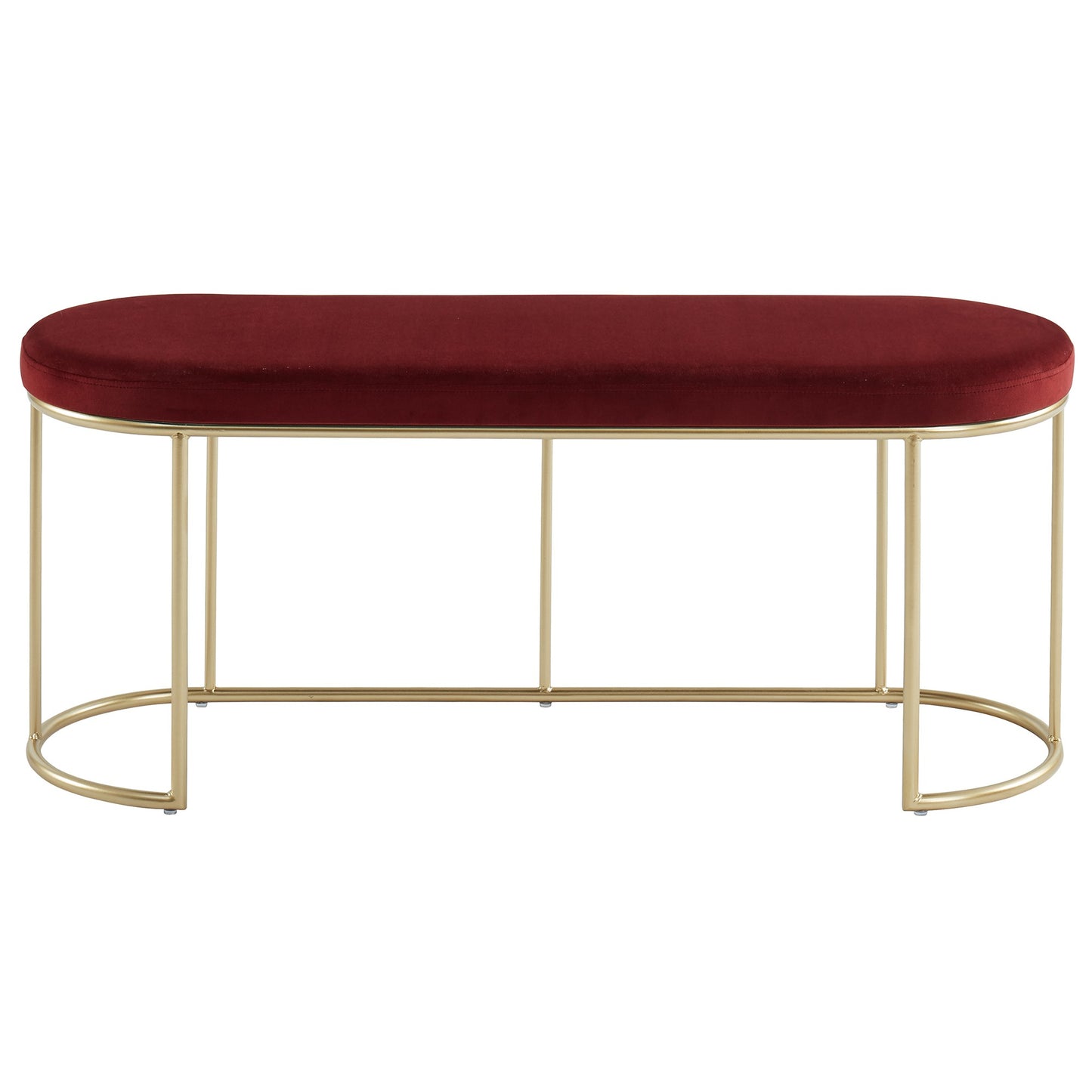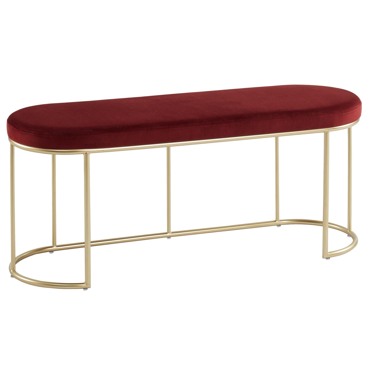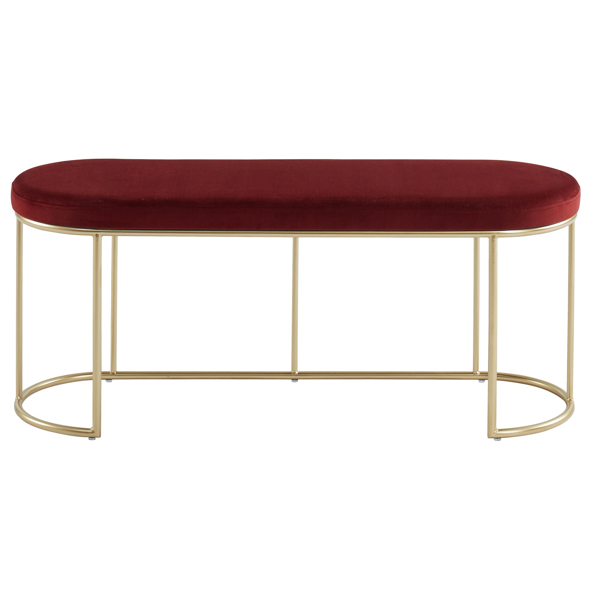 Description Features Specifications Beautiful modern bench with rich velvet upholstery. The classic oval shape and sleek metal base in a matte gold finish just take it to the next level! So many versatile uses - in an entryway, as extra seating in a living room, at the end of a...