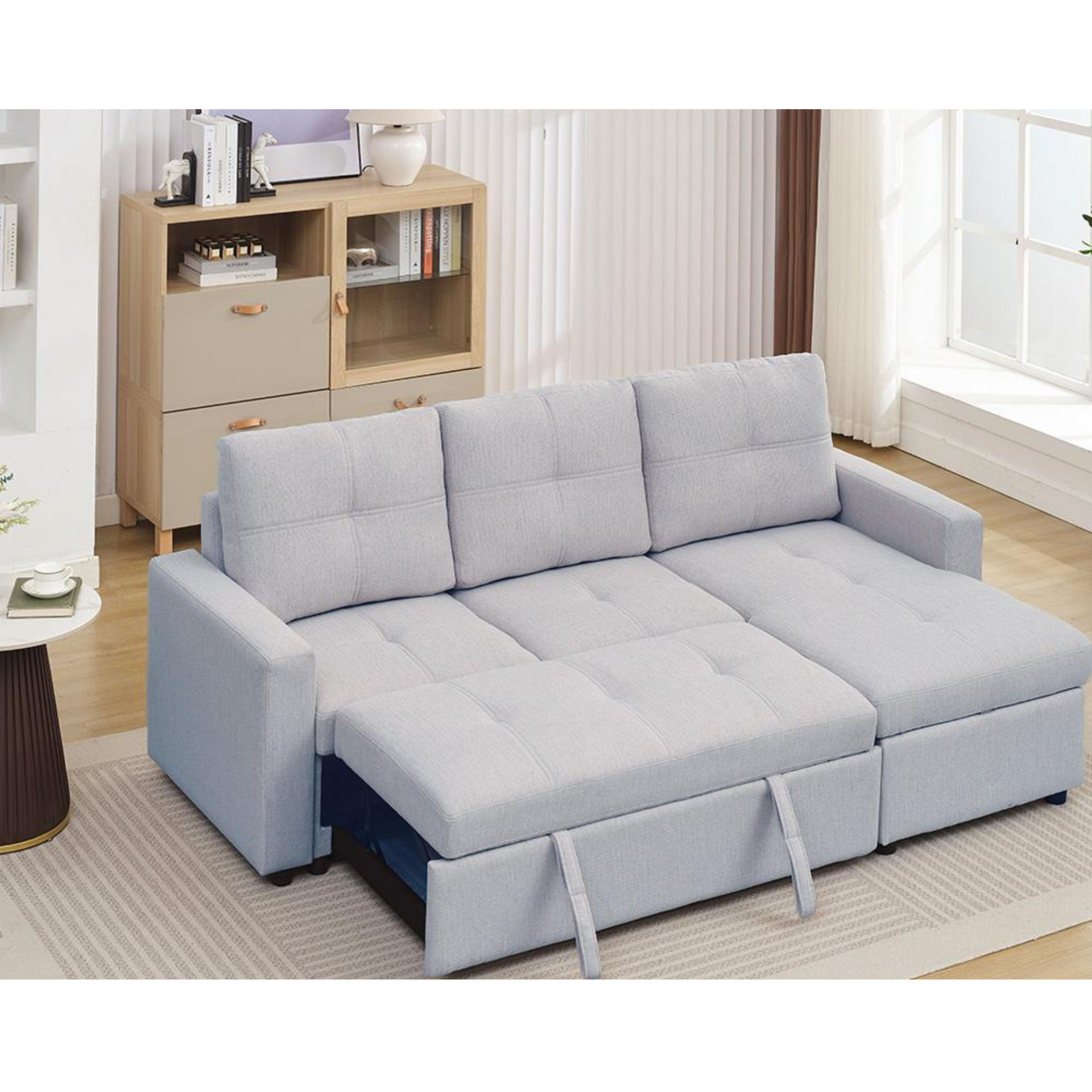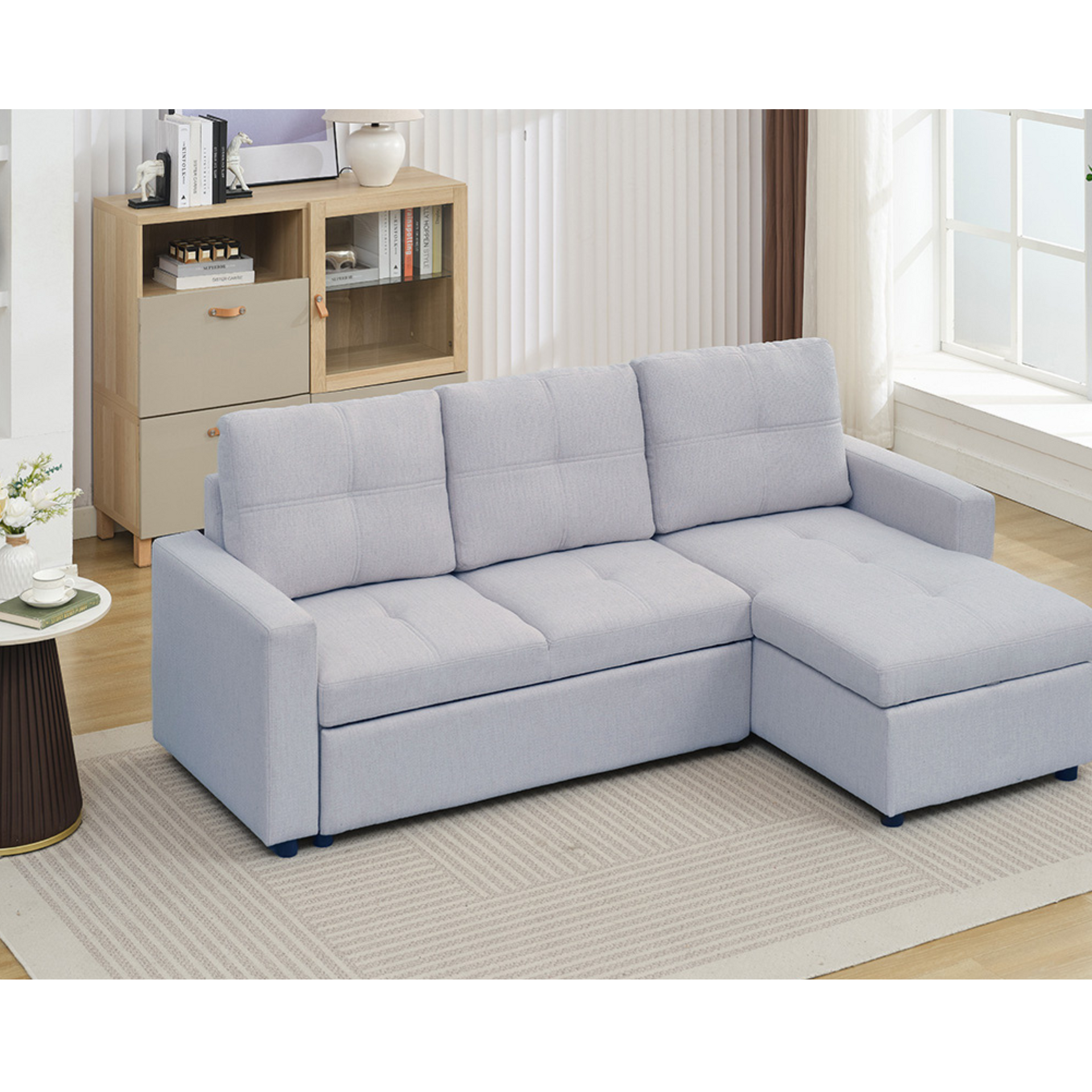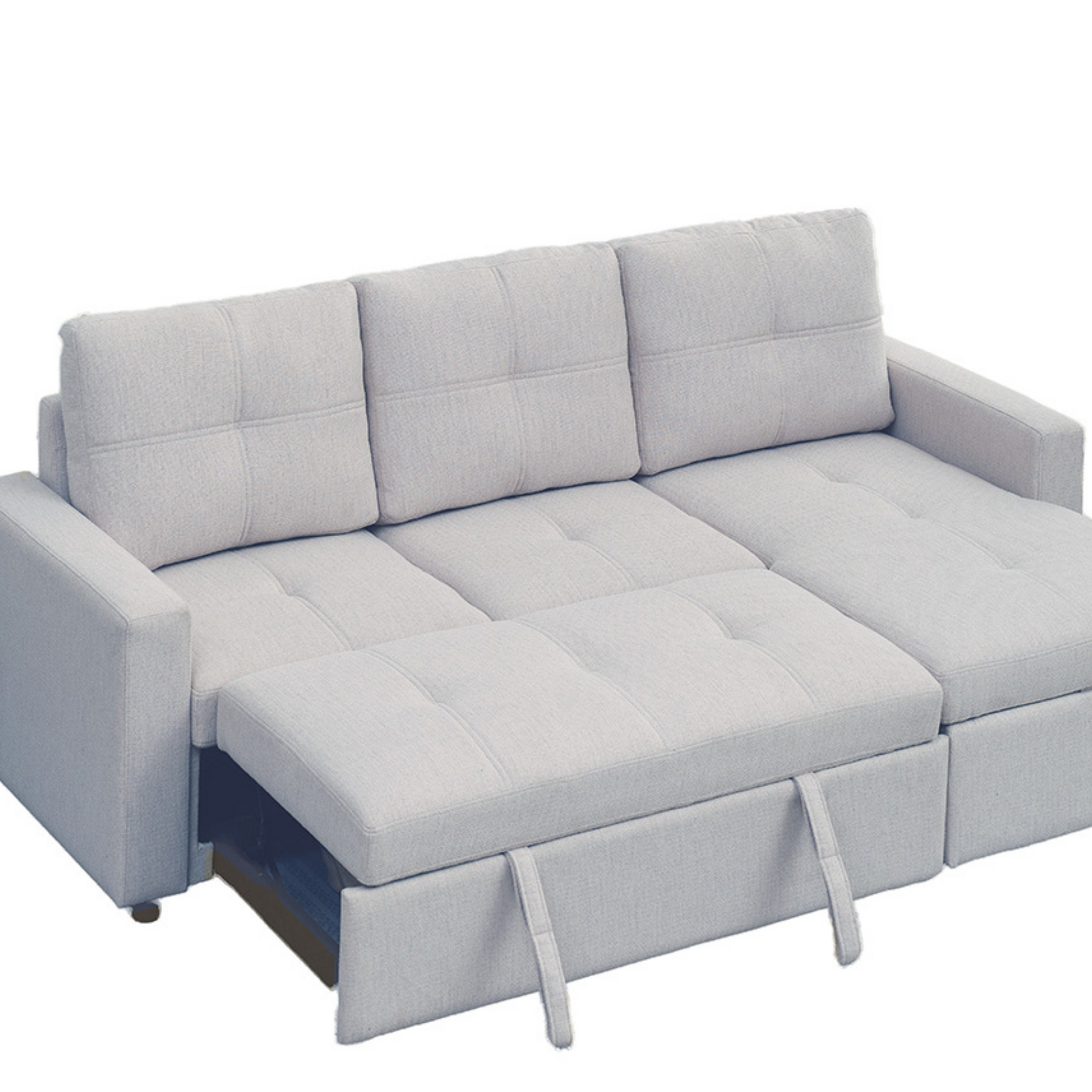 The Jaxon Sectional offers a perfect blend of style and functionality for your living space. Upholstered in a soft grey fabric with a tufted back, this reversible sectional can easily be converted into a bed, providing extra sleeping space when needed. The chaise includes hidden storage, offering a convenient place...