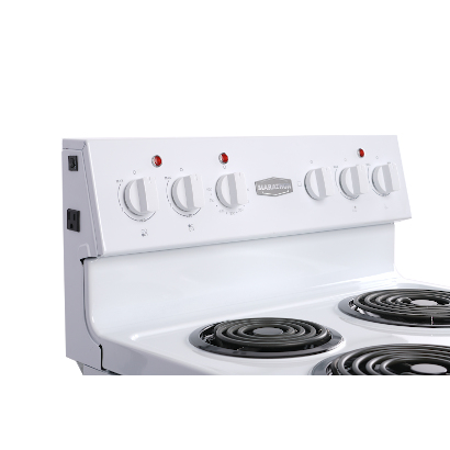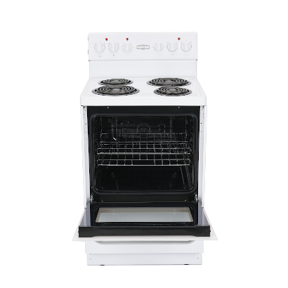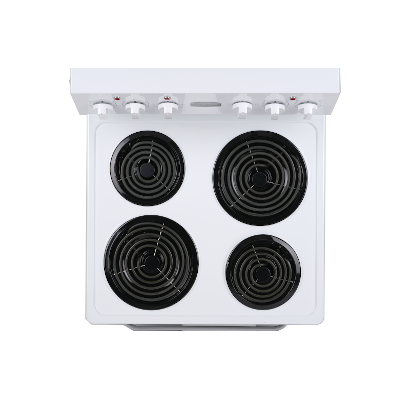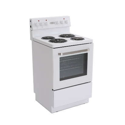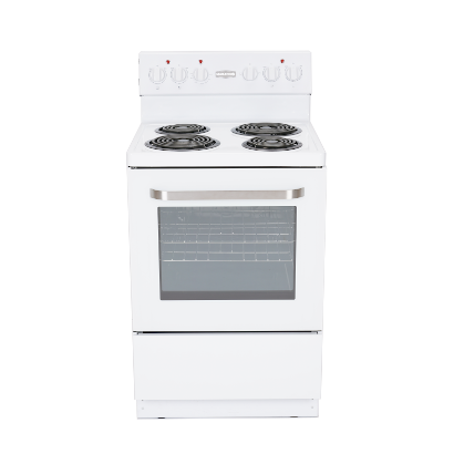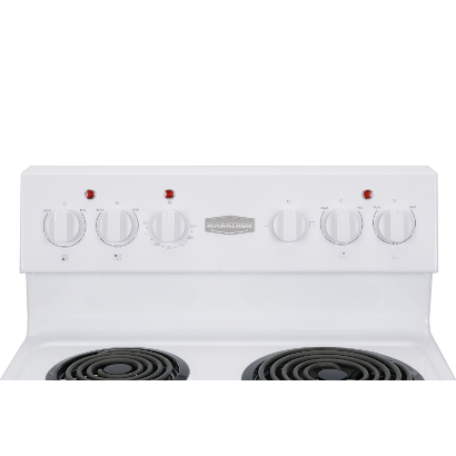 Description Features Specifications Marathon 24" White Electric Coil Range Perfect for the cottage, apartment or wherever space is tight, this Marathon 24” wide contemporary style range features 2-6’’and 2 Fast Heating 8’’ coil burner elements with porcelain burner bowls. Bake or Broil in the spacious 2.7 cu.ft. easy clean oven...