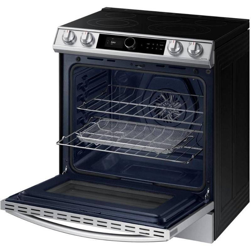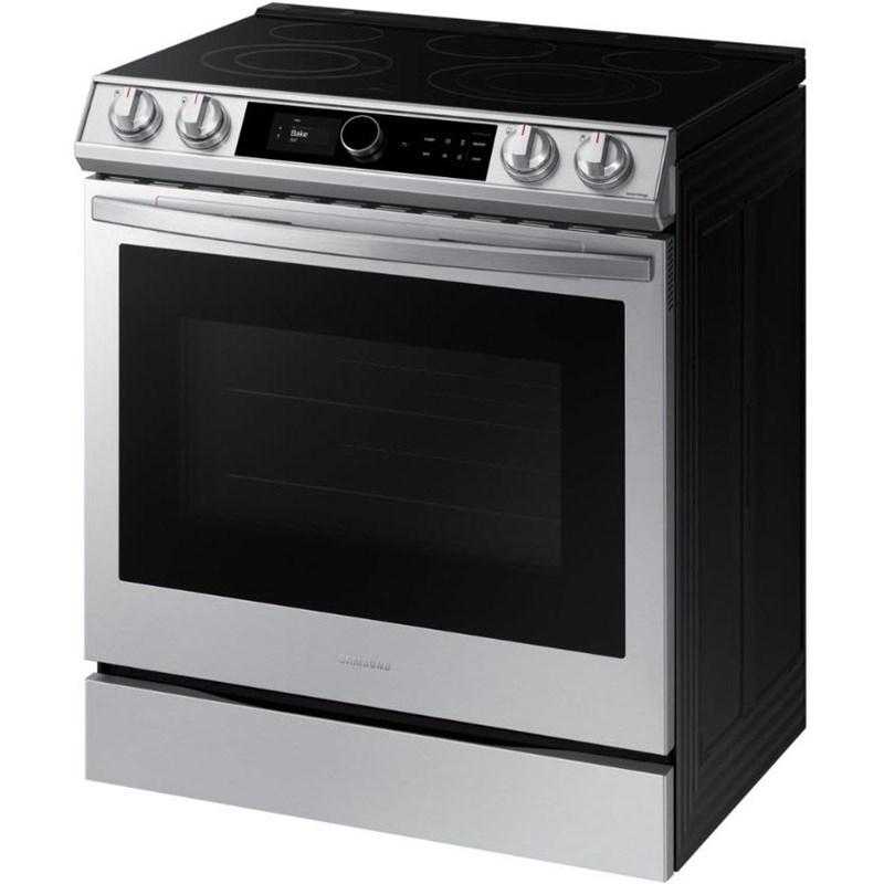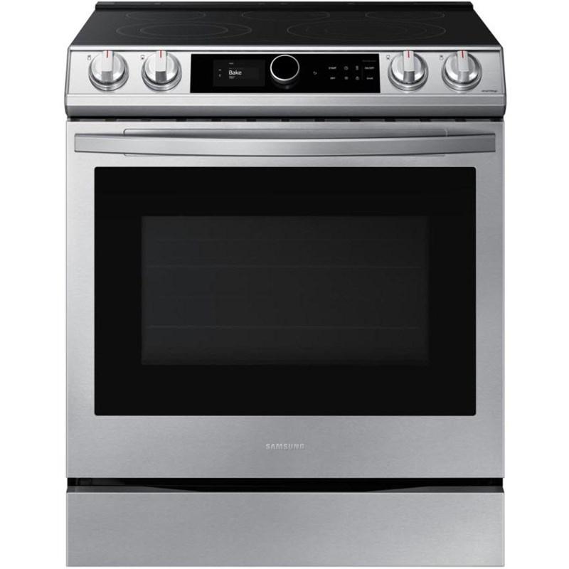 Description This 30-inch wide Samsung slide-in electric range features a 6.3 cu.ft. oven capacity, Wi-Fi connectivity, voice control (Bixby) and True Convection Technology.