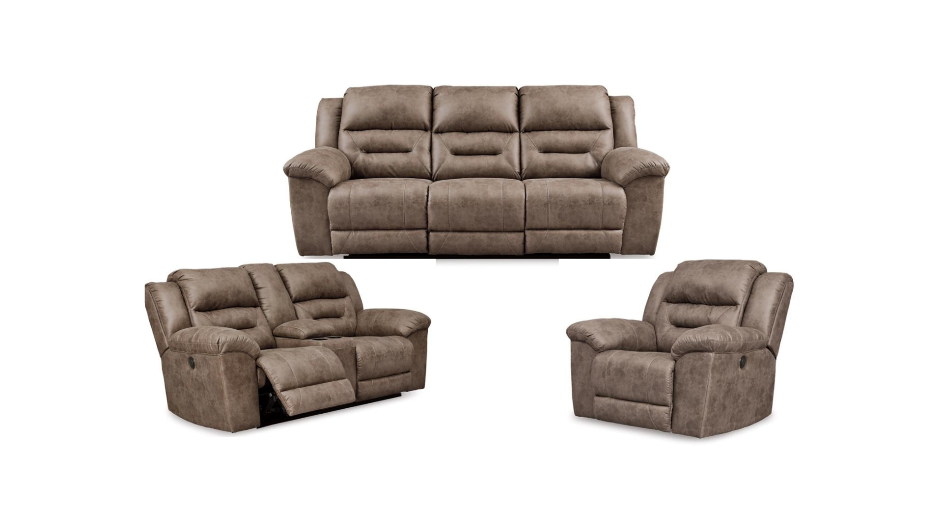 Stoneland Power Reclining Sofa, Loveseat, Chair Set in Fossil