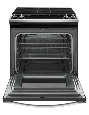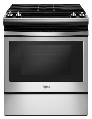Description Features Specifications Whirlpool presents a slide-in gas range featuring a spacious 5.0 cu. ft. oven and a powerful 4-burner cooktop. Two (2) SpeedHeat™ burners allow you to sear and boil quickly at ultra-high temperatures, while the special AccuSimmer® burner delivers just the right power for gentle simmering. Continuous grates...