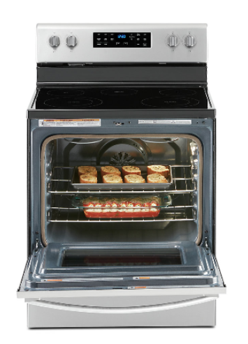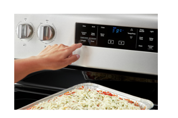 This Whirlpool® electric convection oven with fan convection cooking helps you get dinner to the table. Skip preheating for favorites like pizza with Frozen Bake technology. This fingerprint-resistant finished, self-cleaning oven prevents cooked food from getting cold with a Warm Zone element.